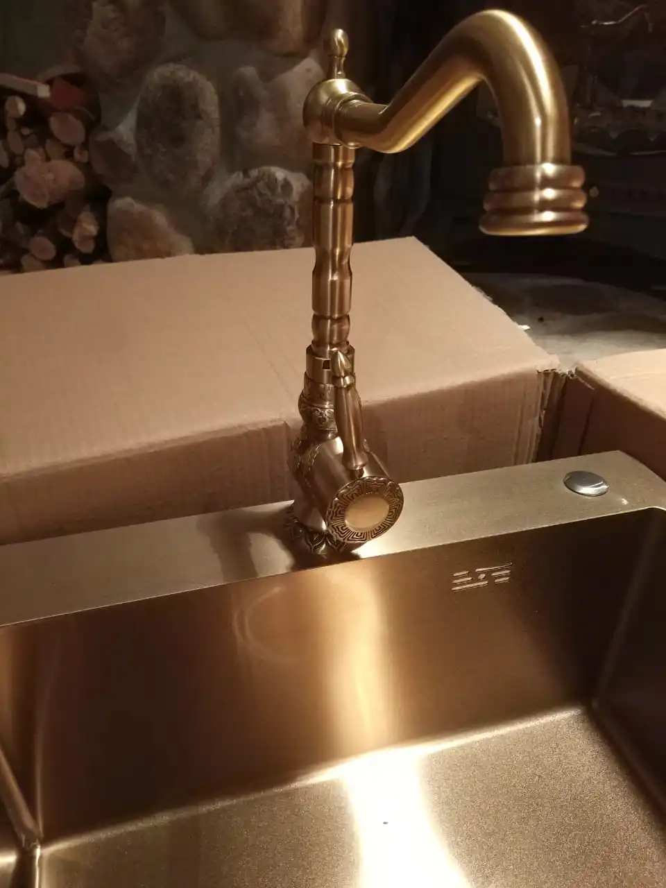 Быстро дошла, в мск за 3-4 дня. В составе решетка для посуды и дозатор для мыла. Цвет мойки немного бронзовый, темное золото. По качеству претензий нет. Упаковка немного помятая.