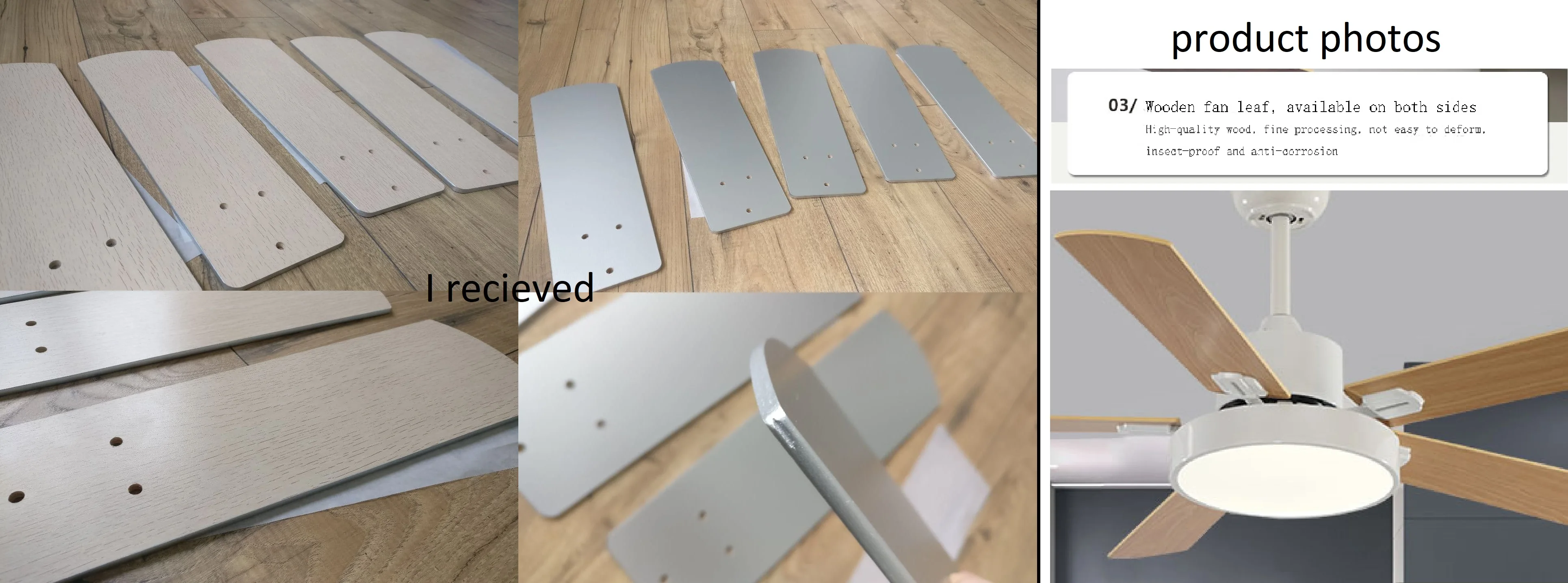 Настоятельно не рекомендуется покупать у этого продавца ничего. Для ясности, я заказал модель 2 с лезвиями из модели 1. На странице продукта лопасти вентилятора имеют хорошее качество деревянной текстуры с обеих сторон, но я получил лезвия с другой дешевой текстурой на одной стороне и серебряной краской на другой. Одно лезвие имеет дефект. Некоторые металлические детали имеют царапины и необработанные края. В целом, продукт похож на набор «сделай сам», чем вентилятор «почти готов к использованию». Нет информации о монтажных светодиодах и установке затемняющего круга в люстр. Диаметр круга слишком большой, поэтому я не могу поместить его на место. Чрезвычайно разочарован продавцом и его безответственностью. Единственный ответ-«Жаль, что вам не нравится продукт». Но это не «мне не нравится», это другой продукт с гораздо более низким качеством.