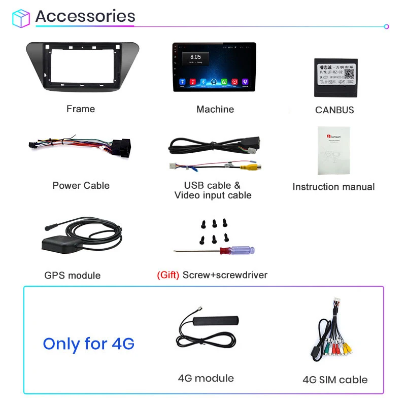 >> Junsun V1 For Lifan X50 2015-2019 Function> Basic functions: Android 10.0 + 9 inch IPS Screen + Quad Core 1.2GHZ (Eight core 1.8GHZ optional)+ DDR3 1GB Flash (2GB/4GB/6GB optional) + 16 GB Memory (32GB/64GB/128GB optional) + WIFI (4G Network optional)+ Mirror link+ Steering Wheel Control + RDS/DSP(optional)> Special functions:1. PIN to PIN:Junsun radio' power cable is pin to pin, easy to install;2. Built-in Carplay/ Android Auto: V1/V1Pro version supporting, just use your phone cable connect it, stable and easy to use;3. Support Headrest : Only Junsun V1 version support;Optional accessories> AI Voice Control: just say the command word control the radio without hands, make drive more safe> ADAS DVR Camera, Tire pressure monitoring, OBD2, External Microphone, RCA cable;