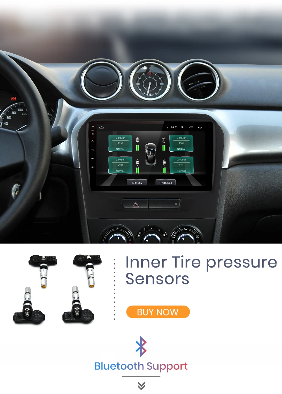 В режиме реального времени отображает 4 давления и температуры, после превышения давления в шинах или ограничения температуры сигнал тревоги будет срабатывать немедленно.