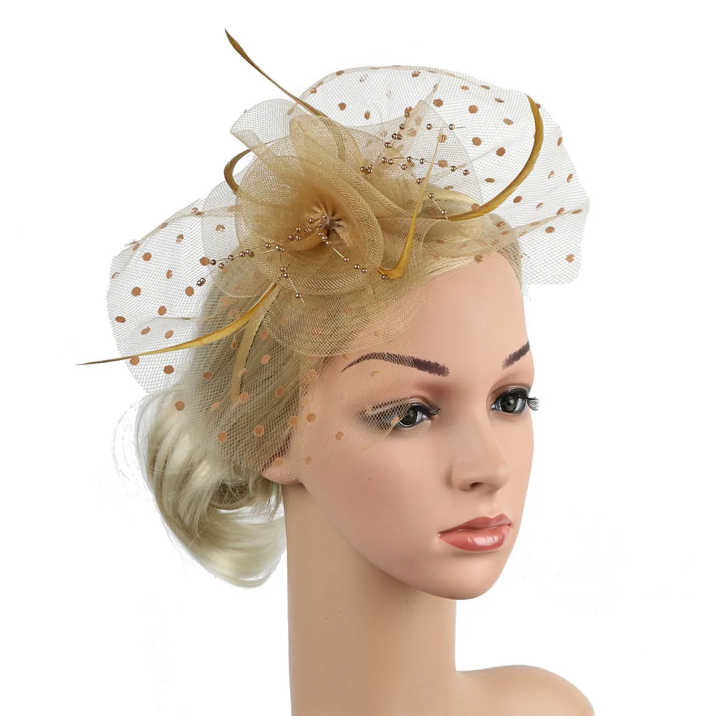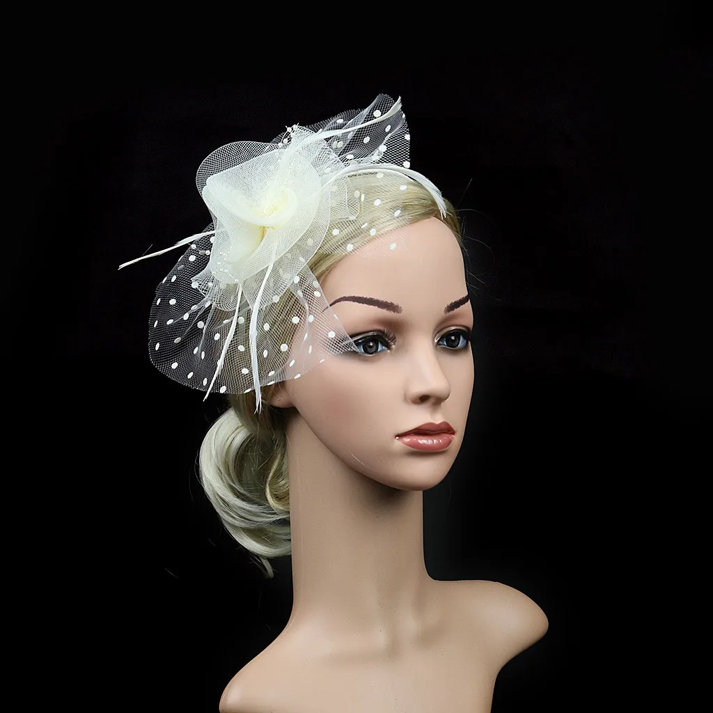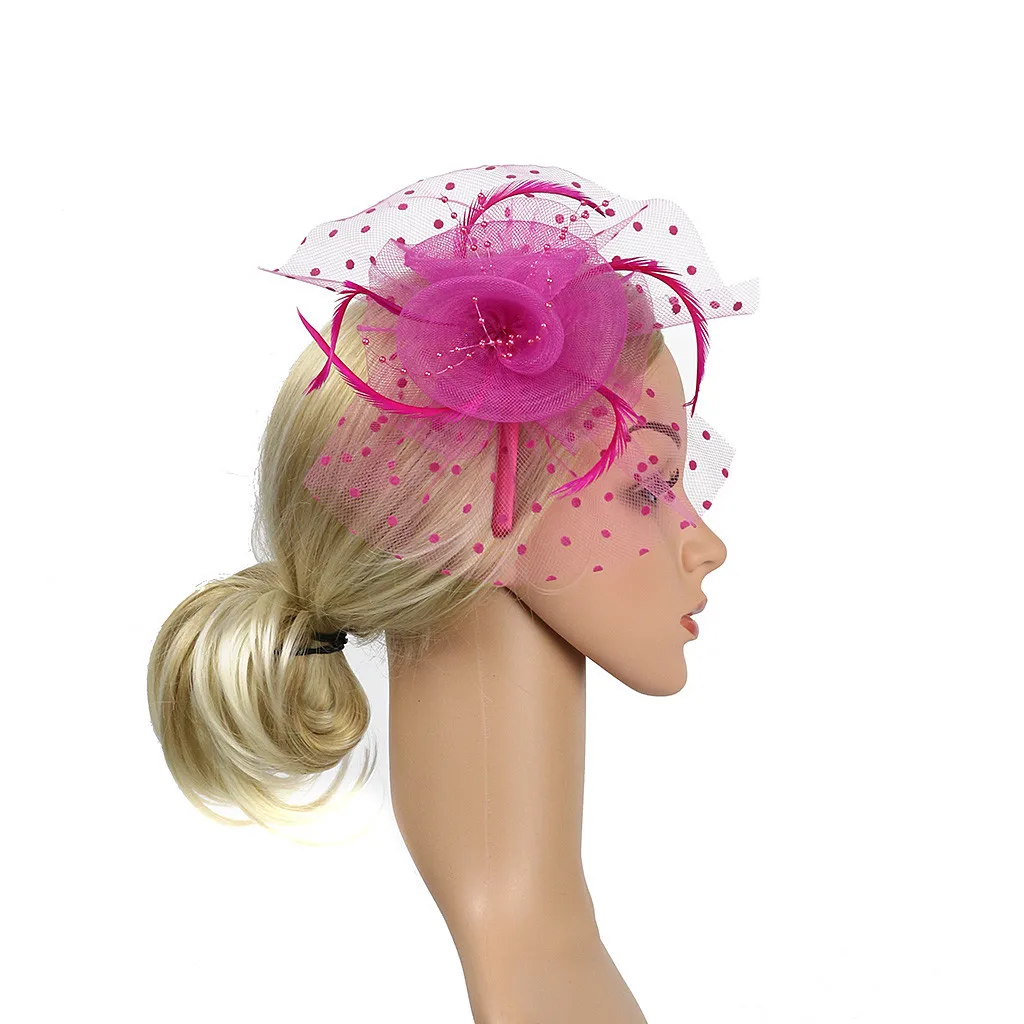 2. Деликатная ручная работа-Милая шляпка-Вуалетка, смешанные детали, включая перья, плетение и скульптурный дизайн цветка.