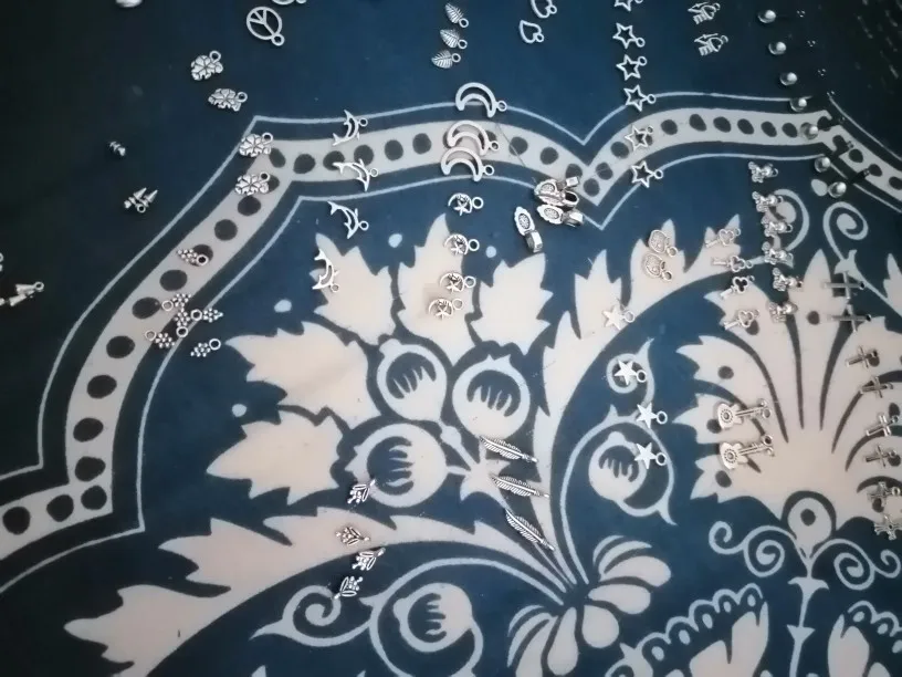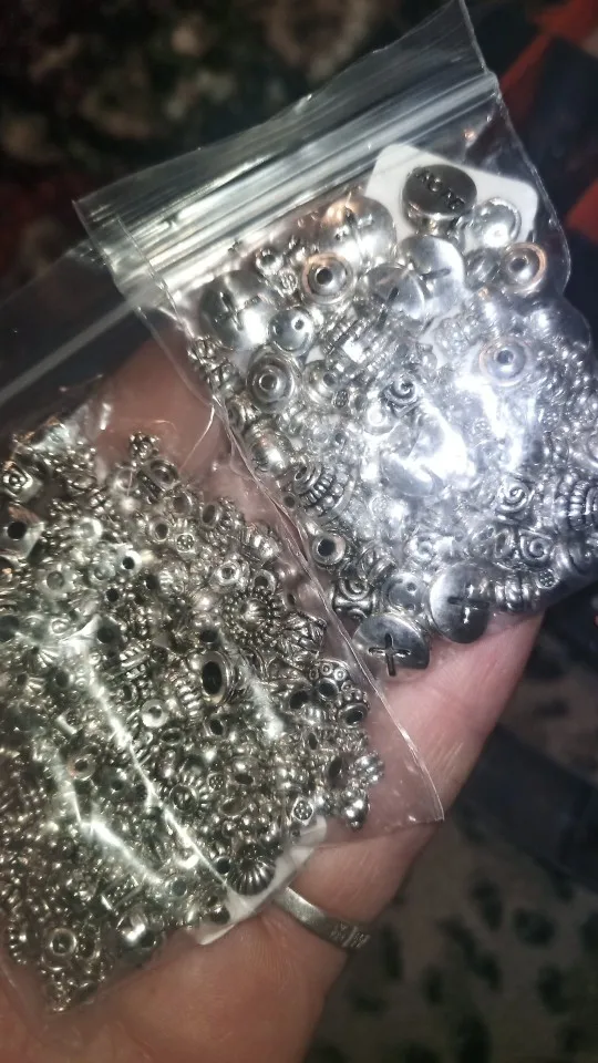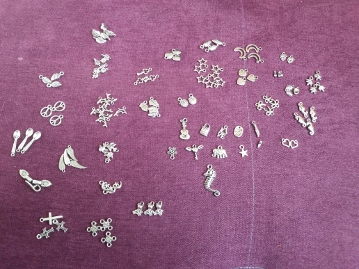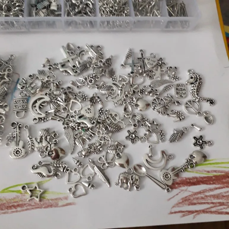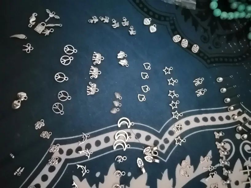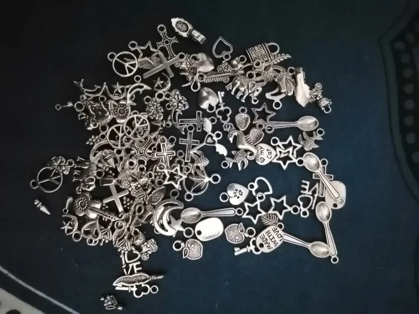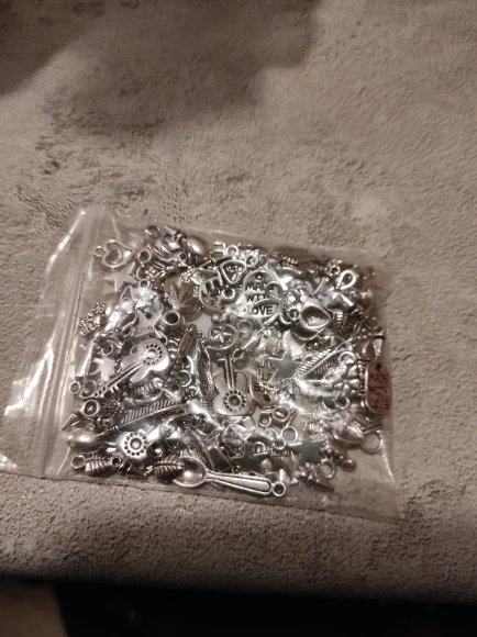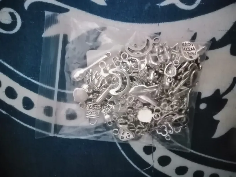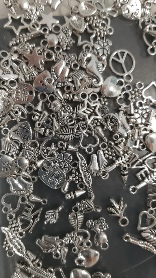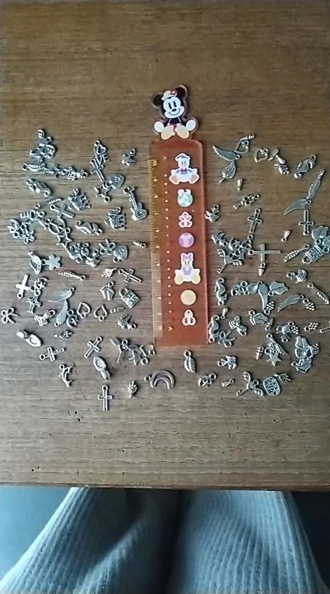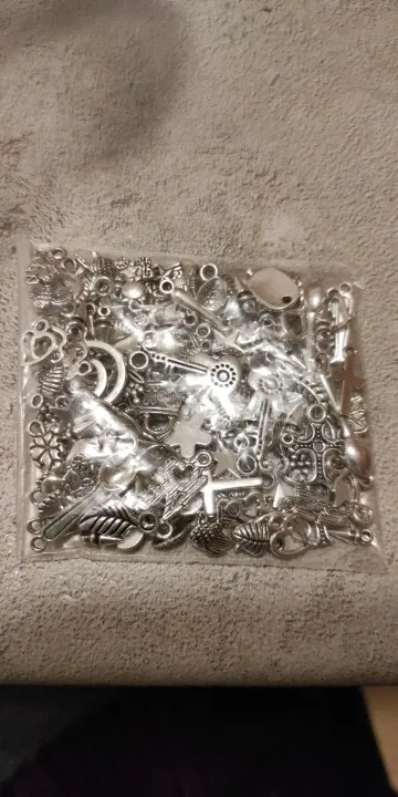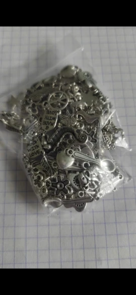 Подвесочки класненькие, на таможне объединили с другой мелочевкой моей, шло месяц, упаковка отличная, вместо 100шт, прислали 134,но там много мелких подвесочек в виде конусов. Состав такой:конуса маленькие, ложечки, крестики, перышки, листочки разные, надписи, гитары, месяцы со звездой, виноградные лозы, звездочки, сердечки, ключики, рыбки, замочки,отпечатки стопы. Мне для кукольный одежды как раз.