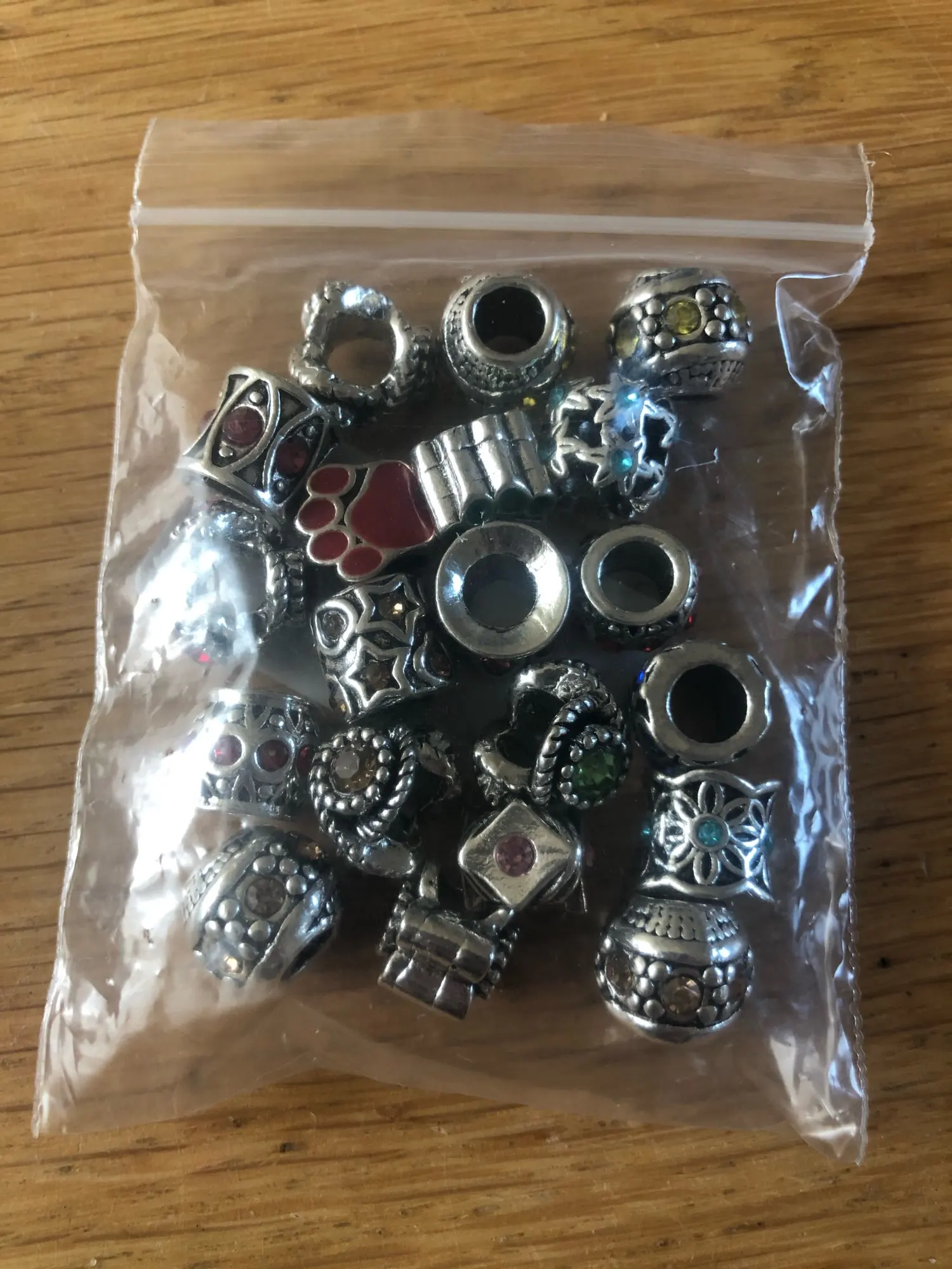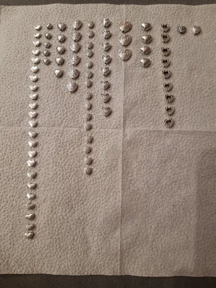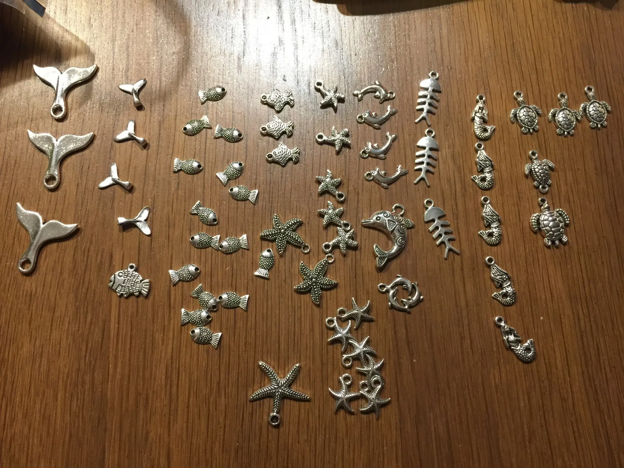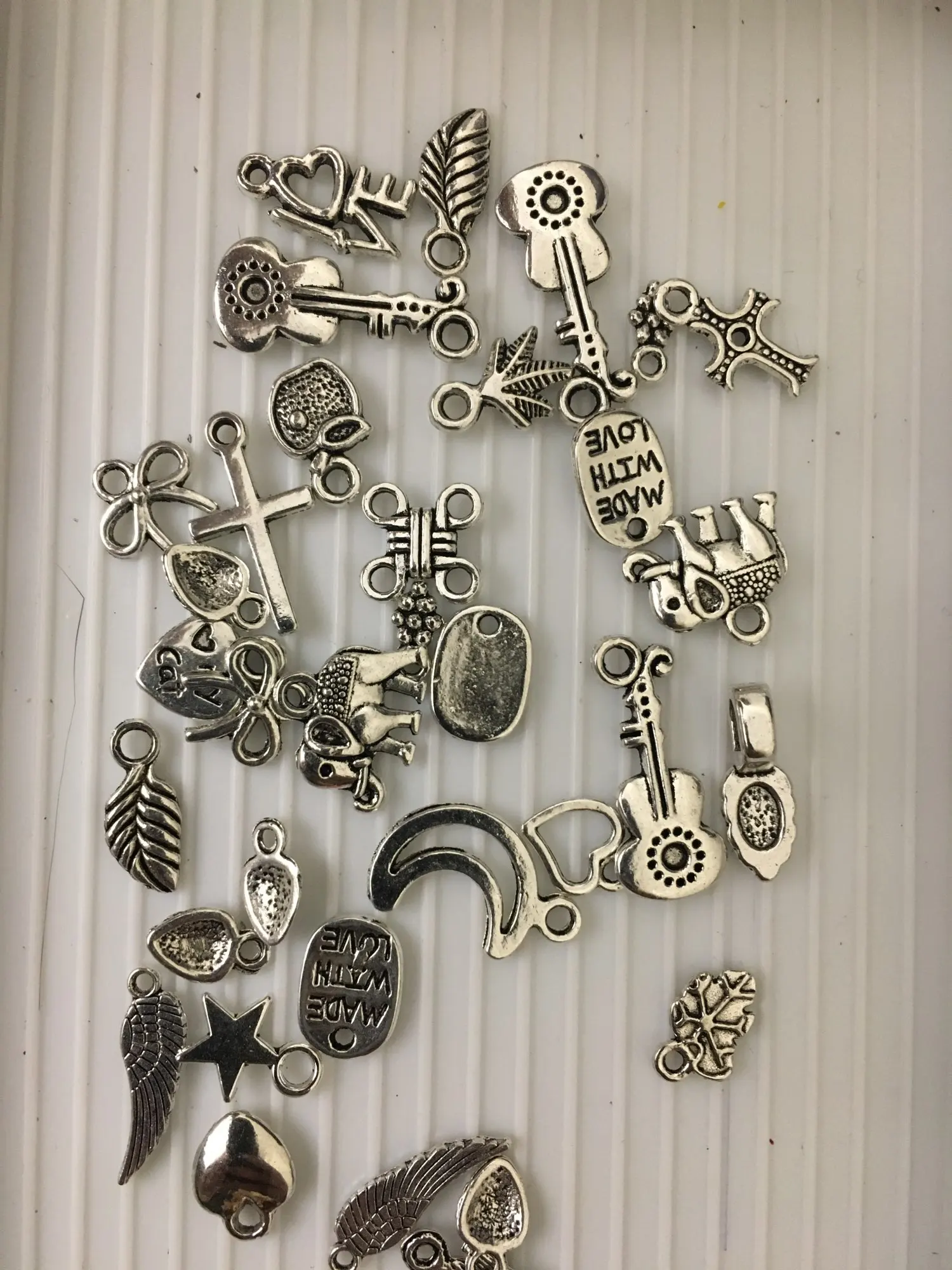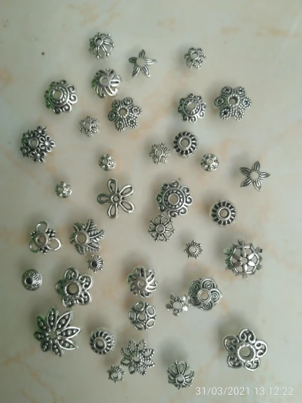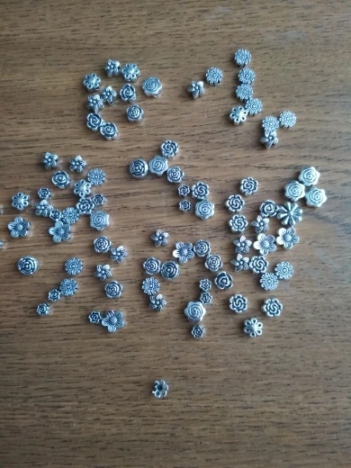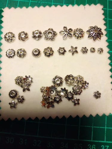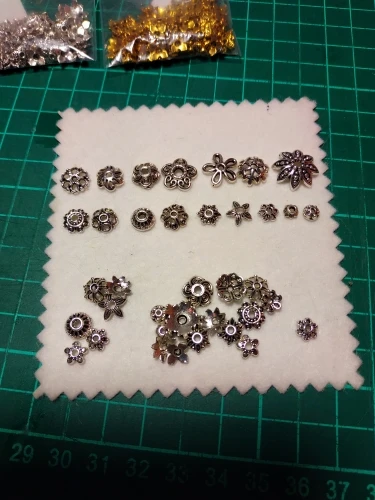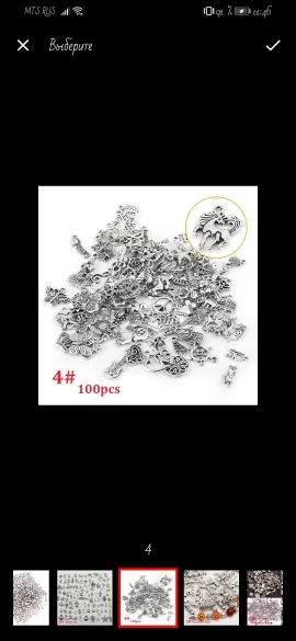 Подвесочки класненькие, на таможне объединили с другой мелочевкой моей, шло месяц, упаковка отличная, вместо 100шт, прислали 134,но там много мелких подвесочек в виде конусов. Состав такой:конуса маленькие, ложечки, крестики, перышки, листочки разные, надписи, гитары, месяцы со звездой, виноградные лозы, звездочки, сердечки, ключики, рыбки, замочки,отпечатки стопы. Мне для кукольный одежды как раз.
