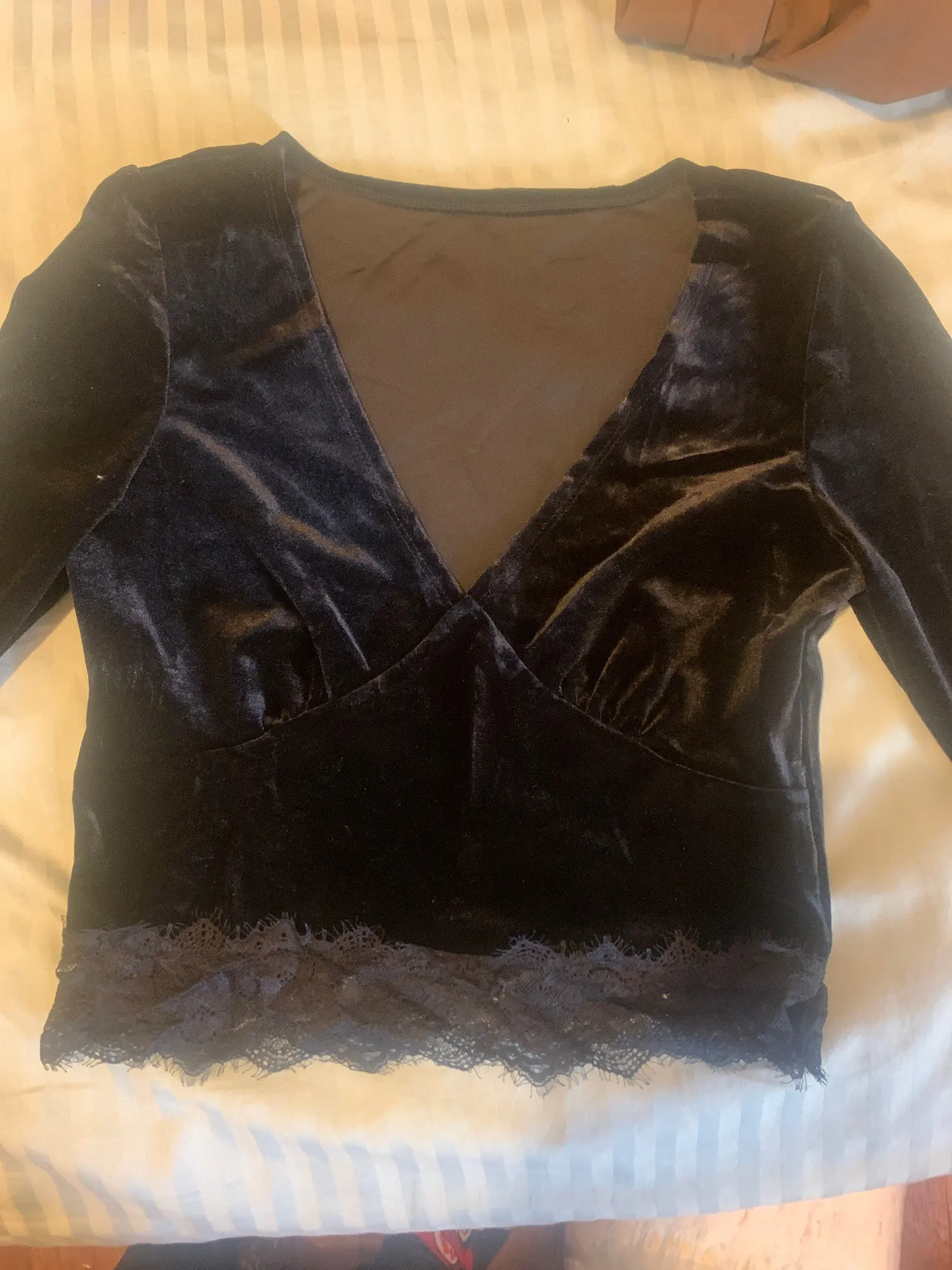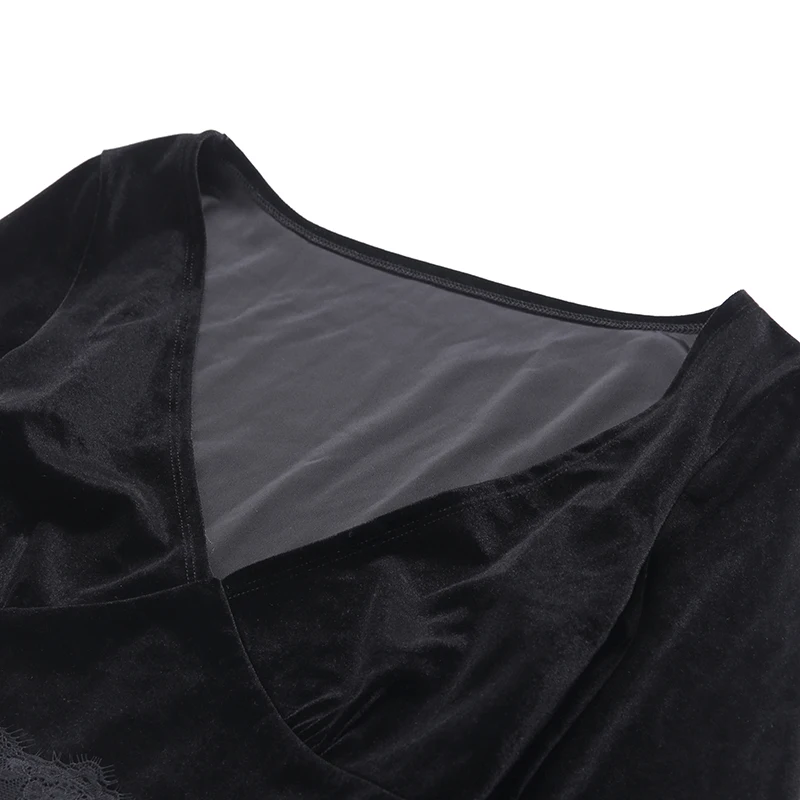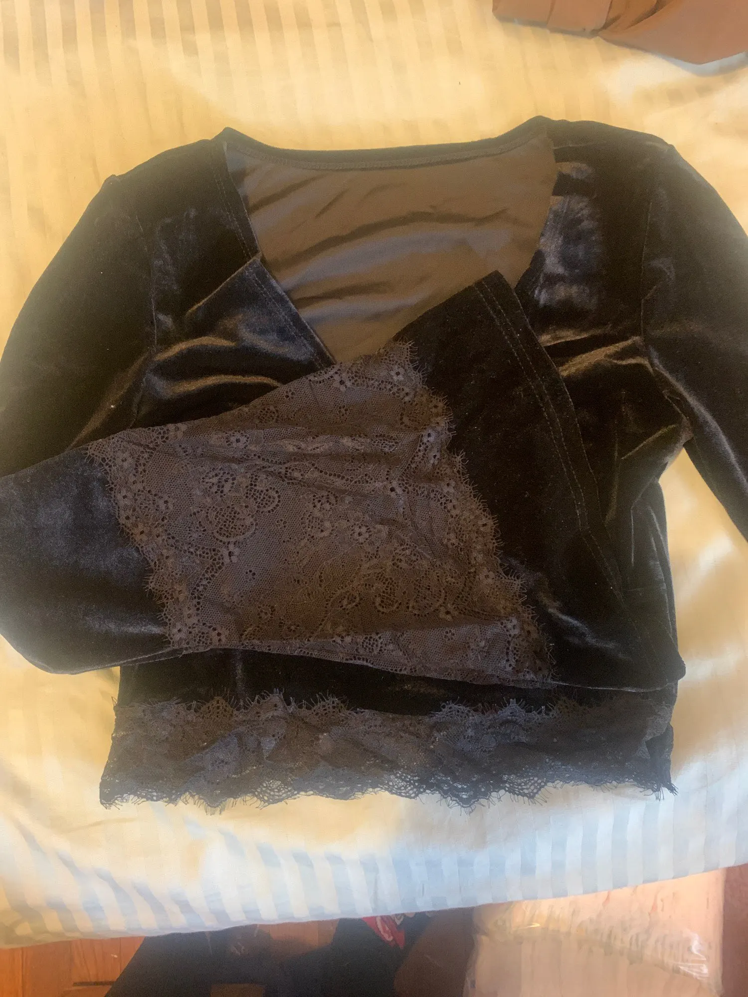 Очень красивый топ с длинными рукавами и черным кружевом. Бархатный материал приятно носить. Мои размеры: 1,65 м, 67 кг, грудь 95 см, бедра 100 см Доставка менее чем за месяц. Минимальная упаковка, которая позволяет избежать ослепления моего мусора, могу ли я подтвердить! Обратите внимание на 9/10