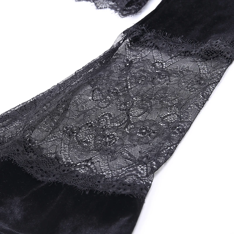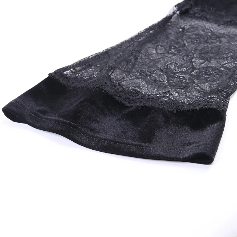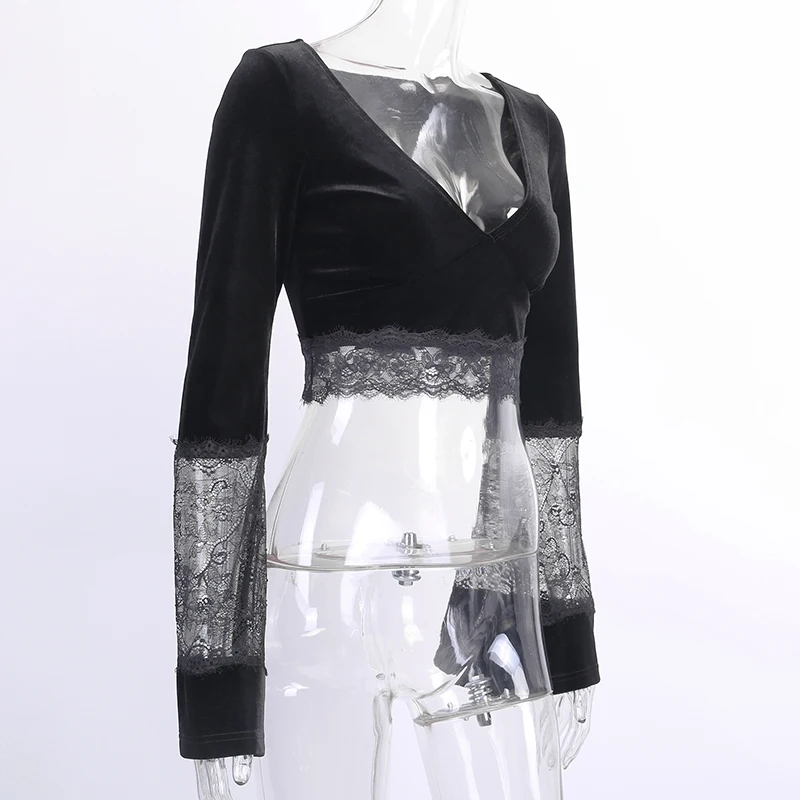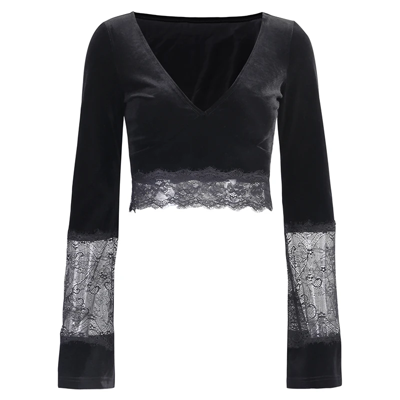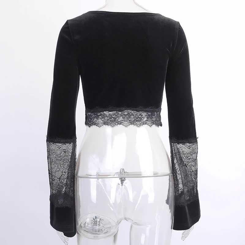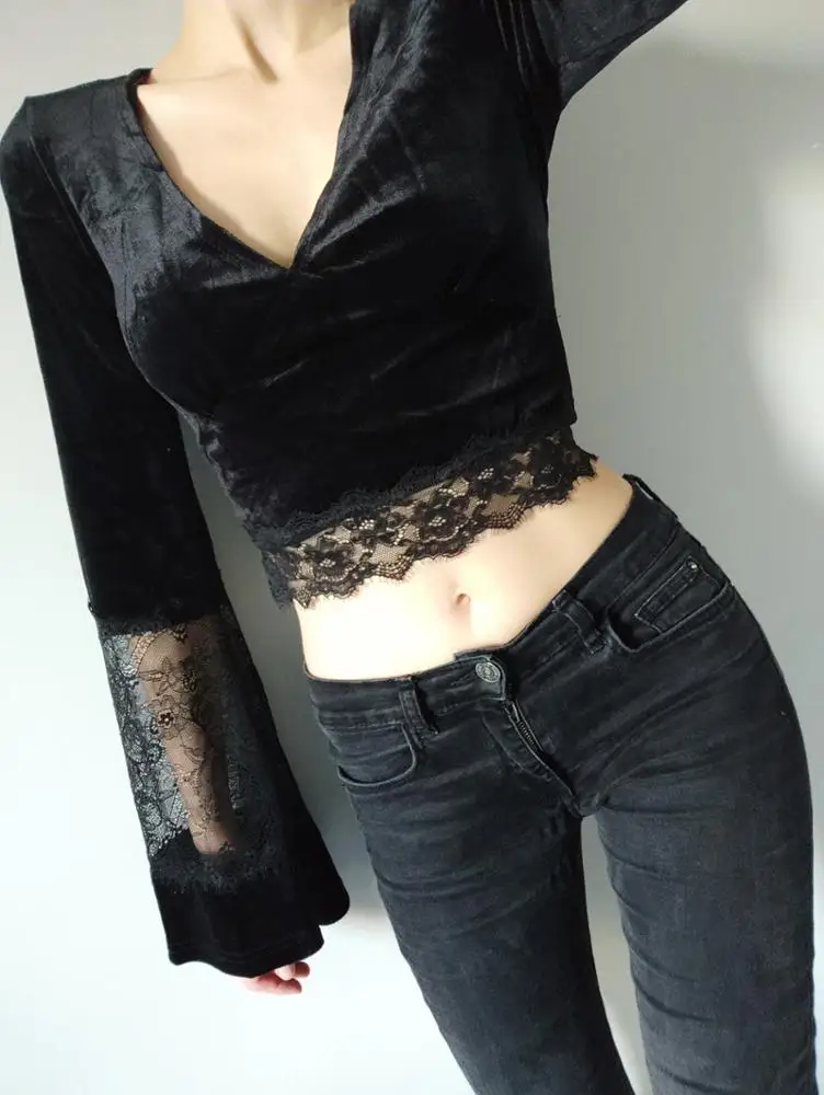Сексуальный женский Готический укороченный топ InsGoth с расклешенными длинными рукавами, кружевная ажурная черная футболка, облегающий женский топ в стиле ретро с V-образным вырезом, элегантный топ