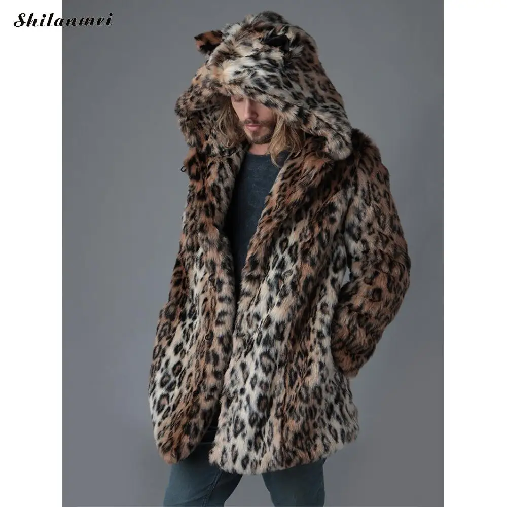 Мужская куртка из 2021 искусственного меха, с капюшоном и леопардовым принтом, длинная шуба 4xl, Теплая мужская верхняя одежда, зима размера плюс