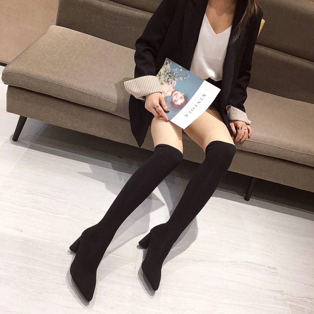 Женские облегающие сапоги NIUFUNI, 4 цвета, вязаные сапоги выше колена на толстом каблуке, эластичные облегающие сапоги с острым носком, осень 2020