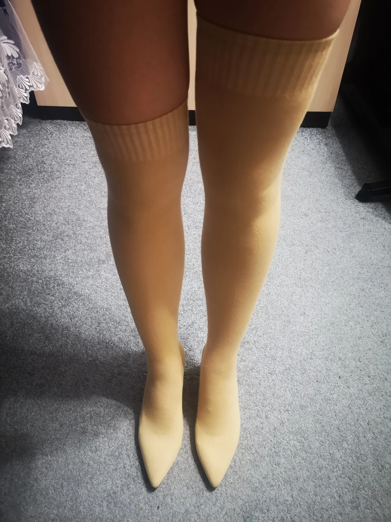 Пришли за 2 недели в СПб. Оперативная доставка,таким продавцам 5 звёзд.Легкие,сапоги -чулки,при натяжении слегка блестят (именно эластичные нити,как в колготках).