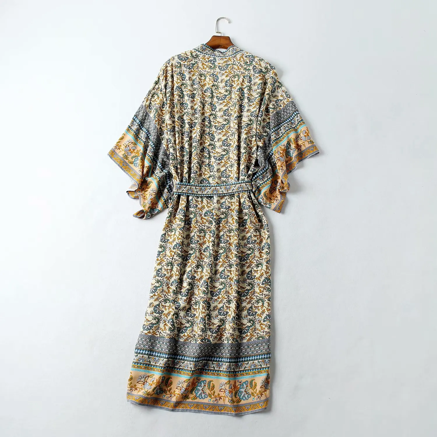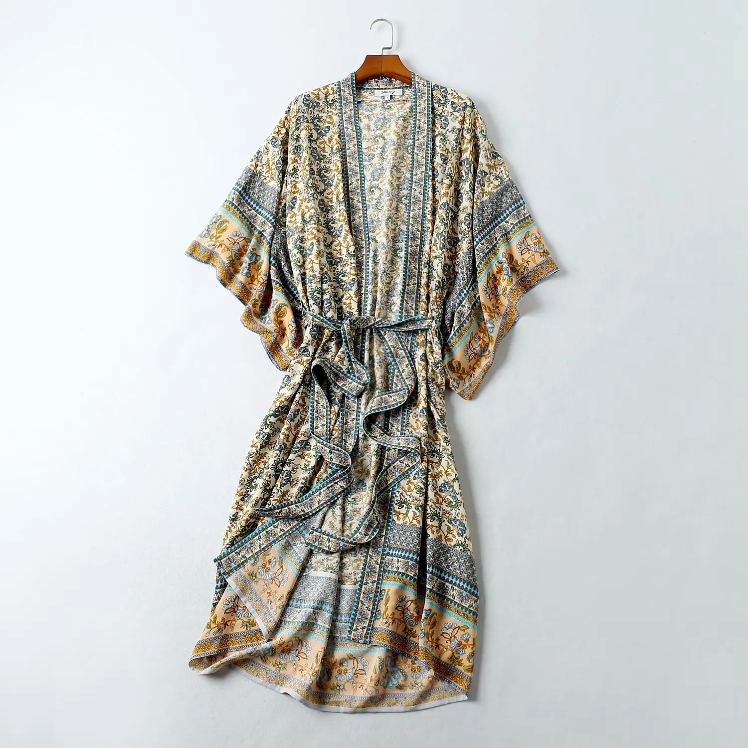 Винтажный шикарный пляжный кардиган, кимоно с поясом и цветочным принтом, длинная рубашка в стиле бохо, женский кардиган, топы, женские бикини