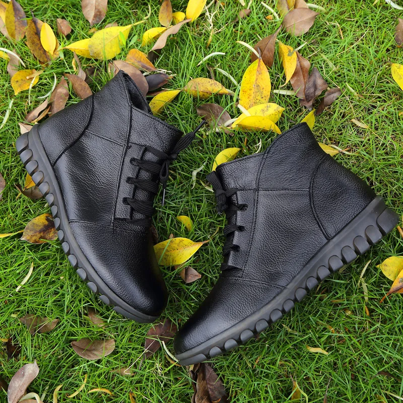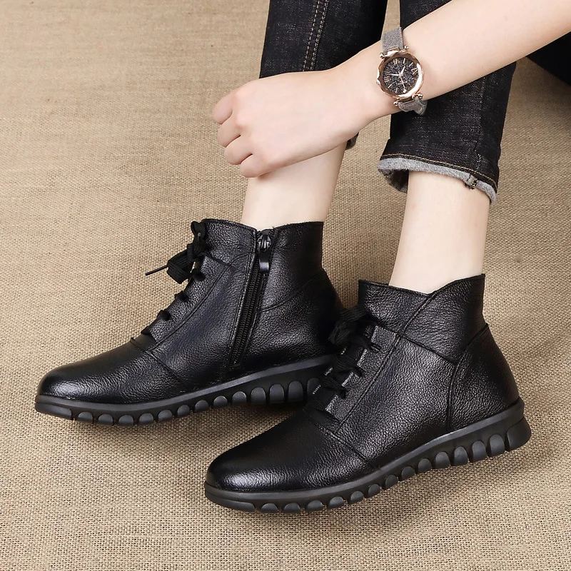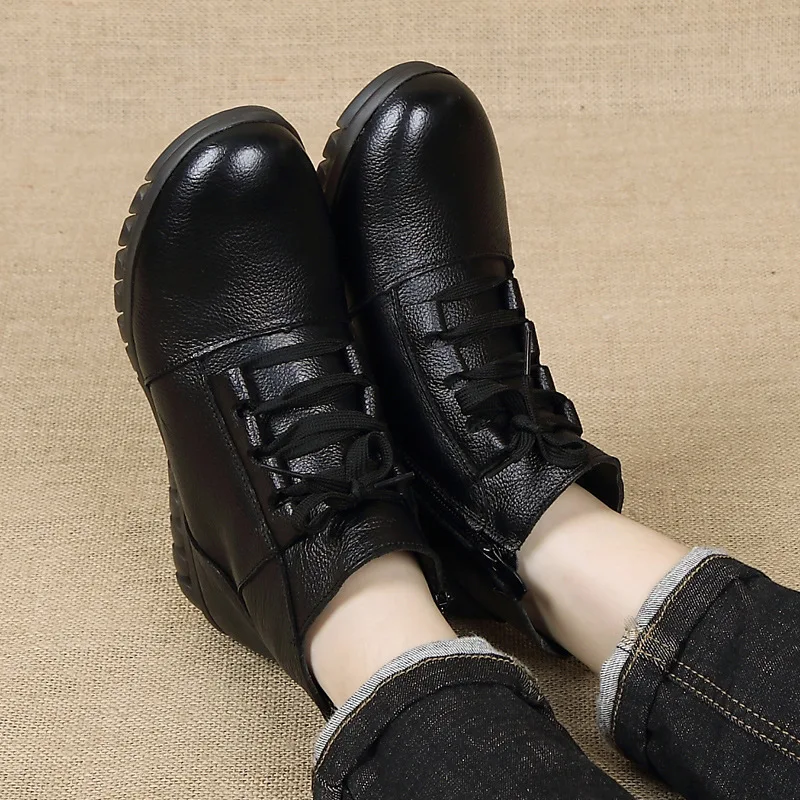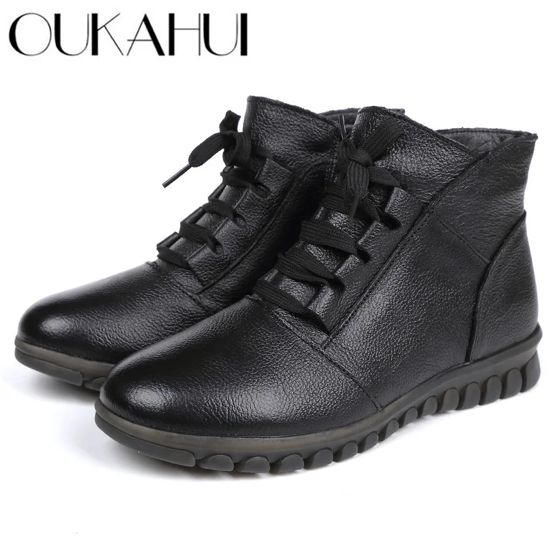 OUKAHUIзимние классические черные женские ботильоны из натуральной кожи на низком каблуке 3 см, на мягкой подошве, на шнуровке, теплые женские ботинки на молнии