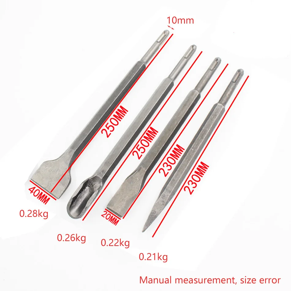 Набор электродрелей из 4 предметов Материал: сплав YG8C, сталь 40Cr Технические характеристики: электродрель с круглой ручкой Острое зубило 14*230, U-образное долото 14*250, плоское долото 14*230*20, плоское долото 14*250*40 мм Комплектация: ударная электродрель Особенности: U-образный паз для корпуса сверла из хромистой стали, быстрое удаление стружки Использование: предназначено для стен с лопатой, подходит для сверления обычных камней, бетона, кирпичных стен и т. д.