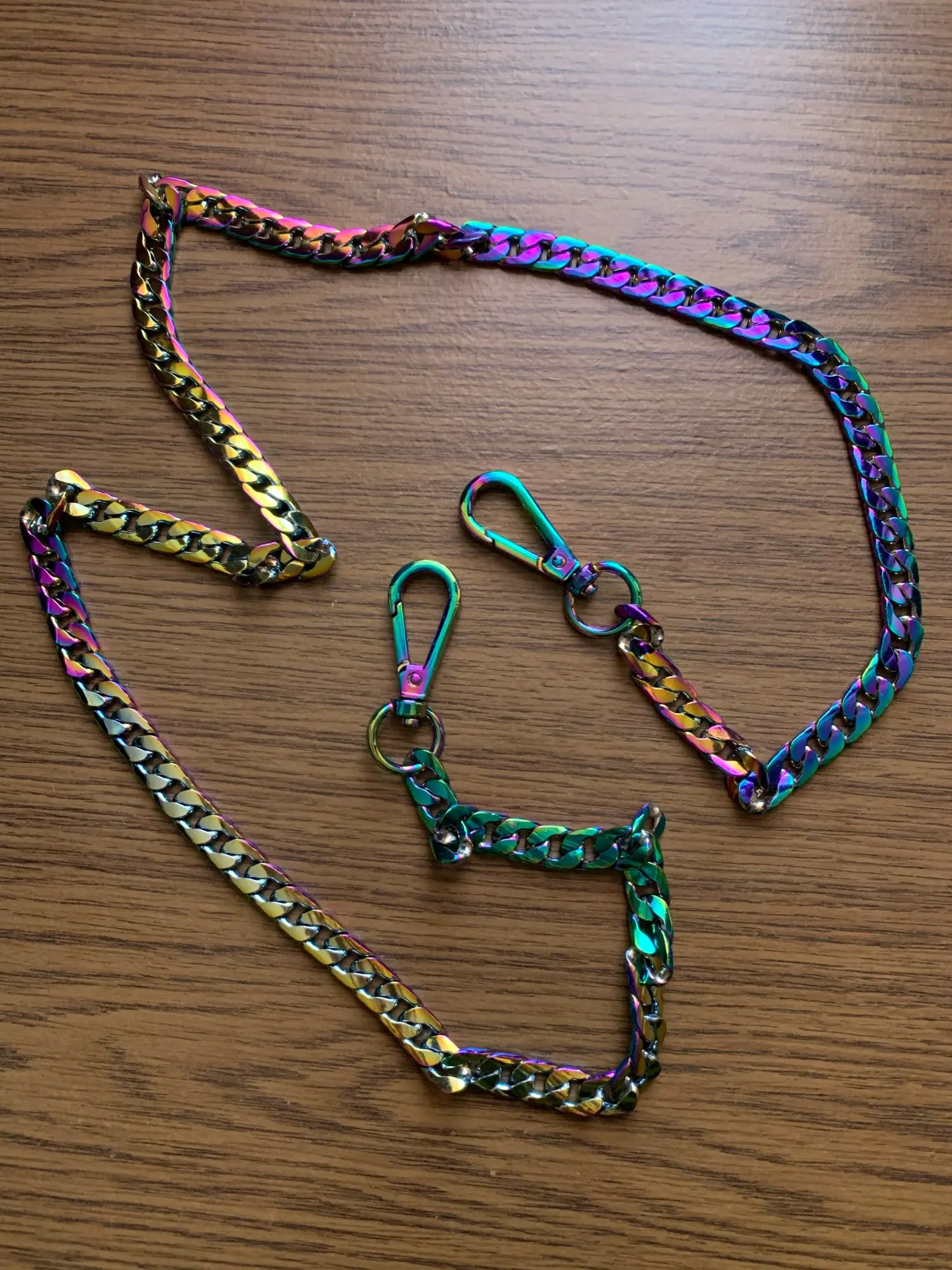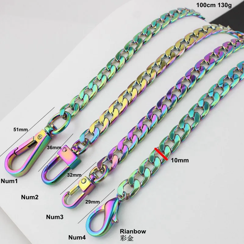 Люблю эту радужную цепочку! Это так красиво и красочно. Быстрая доставка. Около 10 дней. Ширина 10 мм хорошая и не массивная. Я купил 100 мм, чтобы настроить радужную металлическую сумку Kors. Это правильный размер для ношения на одном плече, и у меня 5 футов. Но слишком короткий и плотный для ношения через плечо. Если вы предпочитаете Кроссбоди, закажите более 100 мм. Тот, что является цепочкой, немного скручивается, но его легко сгладить. Порекомендовать этого продавца. Спасибо!