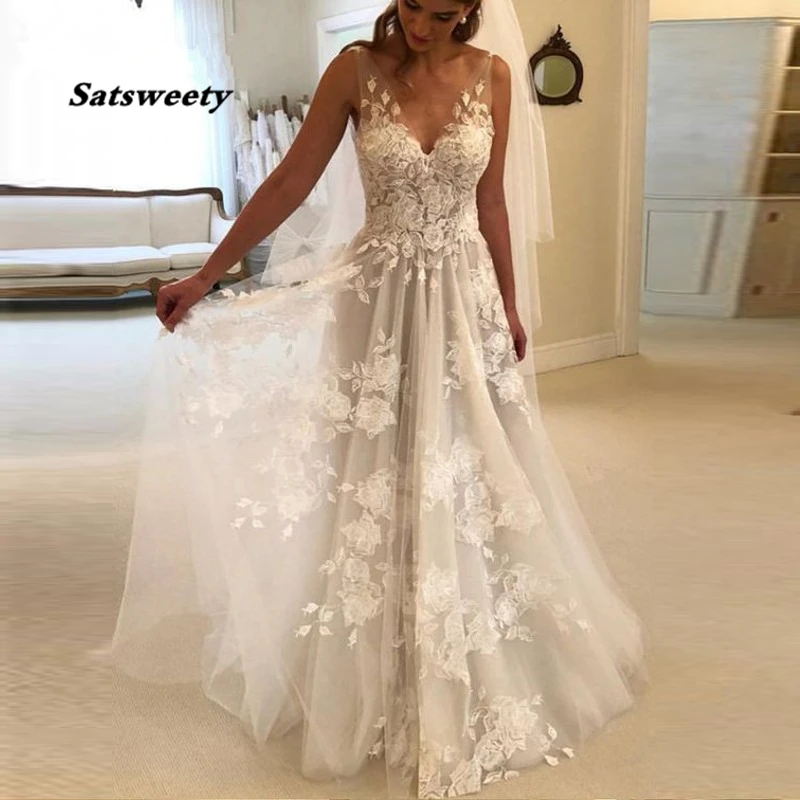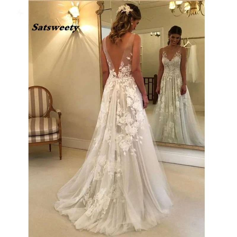Красивое пляжное свадебное платье 2022 с V-образным вырезом и цветами, кружевное свадебное платье с открытой спиной, женское платье
