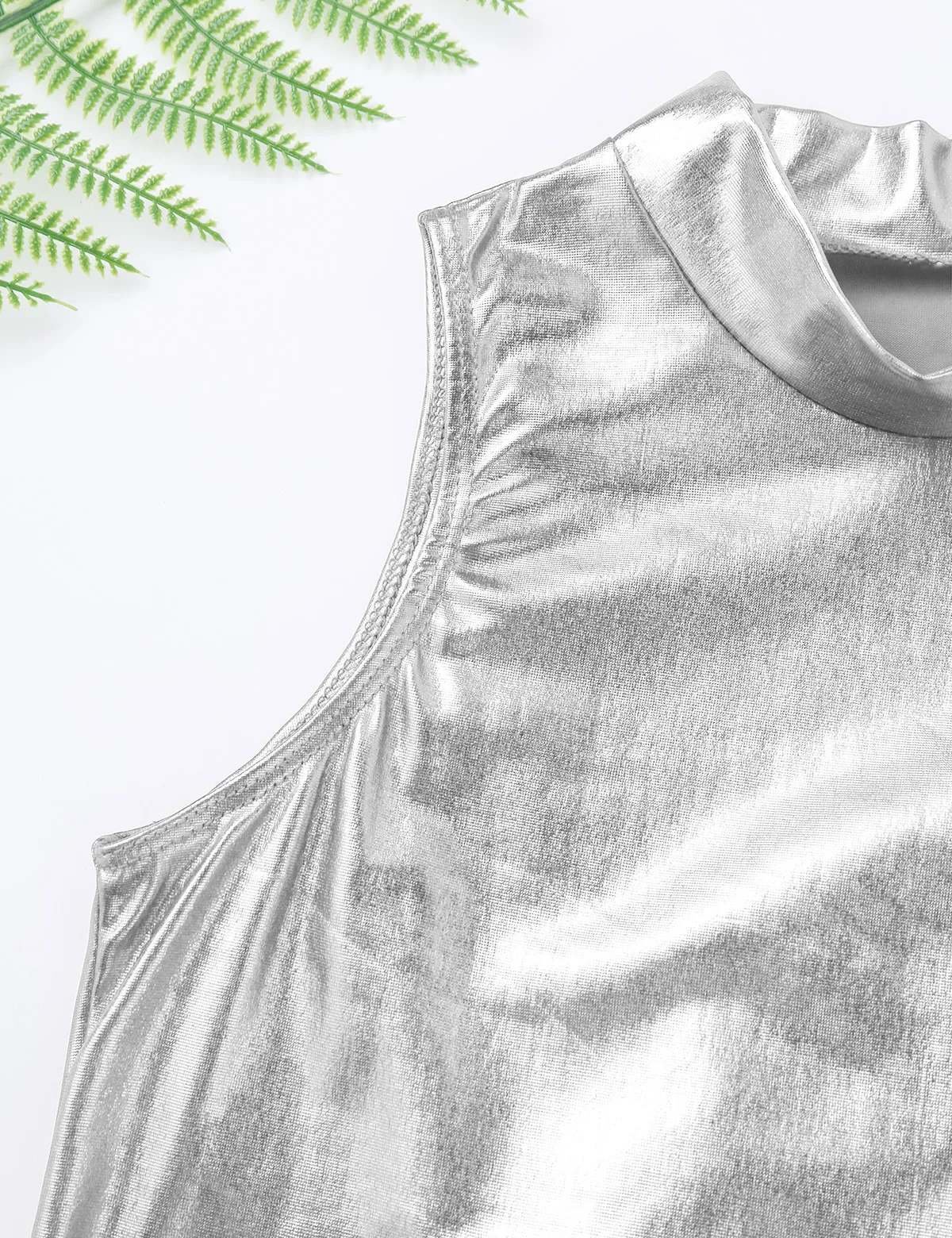 Детский Блестящий металлический укороченный топ из ПВХ для девочек; Однотонная водолазка без рукавов; Балетный танцевальный укороченный топ на бретелях для сцены
