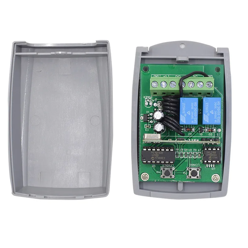 1. Коды обучающего передатчика:Нажмите «learn 1» или «learn 2» в течение 1 секунды, светильник learn_led, затем, нажмите кнопку, которую вы выбираете на передатчике до вспышки «learn_led» и выйдите, код передатчика сохранен.• Повторите вышеуказанные действия для других передатчиков.2. Стирание кодов передатчика:Нажмите «learn 1» или «learn2» и удерживайте, чтобы сделать светодиодный светильник learn _ до выхода,Узнайте 1, чтобы удалить канал 1Узнайте 2, чтобы удалить канал 2