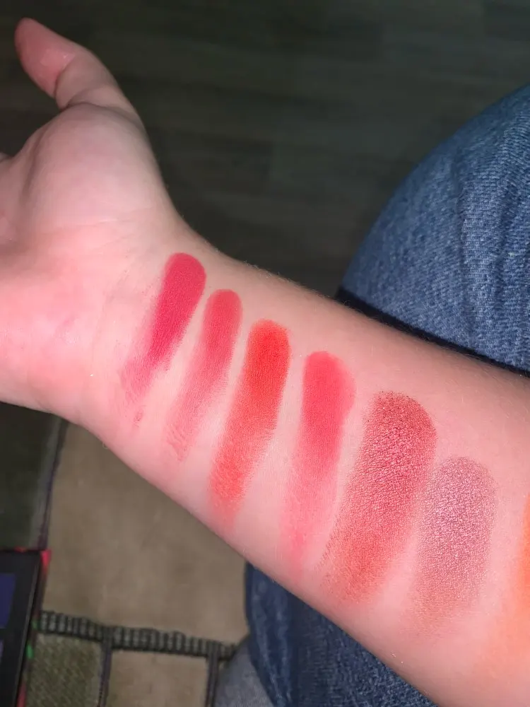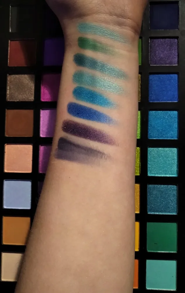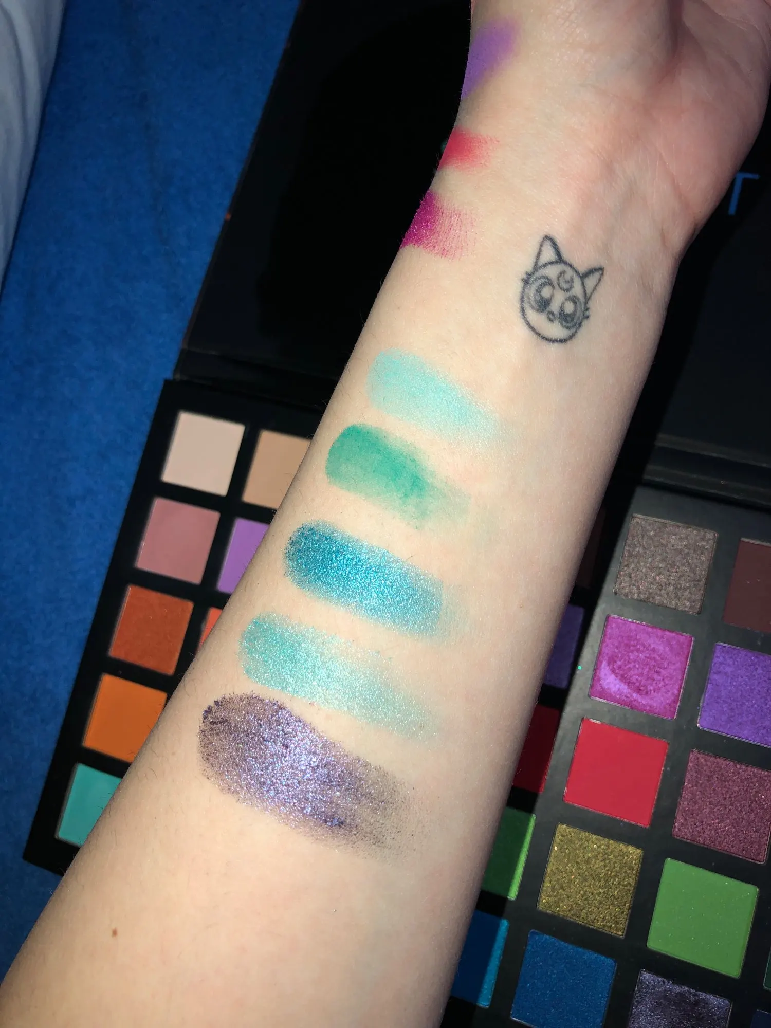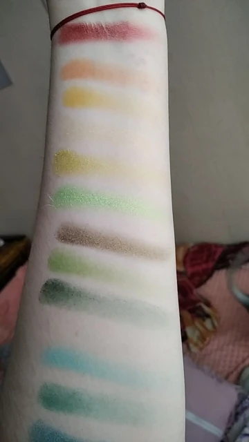 Палетка хороша. Цвета яркие, пигментированные. Оба оранжевые разные) Упаковка приятная, софтач покрытие. Нет зеркала. Свотчи на фото делала "раз, два, свотч" поднаслоила только тёмно-зеленый оттенок, потому что на глазу он выглядел ярче чем на свотчах. Удручает только жёлтый - очень светлый. Еще обратите внимание, что практически все зеленые, синие и фиолетовые представлены в основном в виде сатинов. Тушевала и на базе и без базы. На праймере конечно тушуется 10 из 10, но и без него тени справляются хорошо. Сатины наслаиваются друг на друга посредственно, но матовые поверх сатинов ложатся очень годно. С палеткой можно сделать и яркие макияжи разной сложности, и тёмные, и лёгкую цветную дымку, но что не получится сделать- розовые макияжи. Розовый представлен в виде 2х сатинов. По поводу стойкости не могу ничего сказать, 4-5 часов держится нормально, не тускнеют, но после 5 часов я просто смываю мейк, так что мб они держатся и все 10 часов. Осыпаний очень мало.
