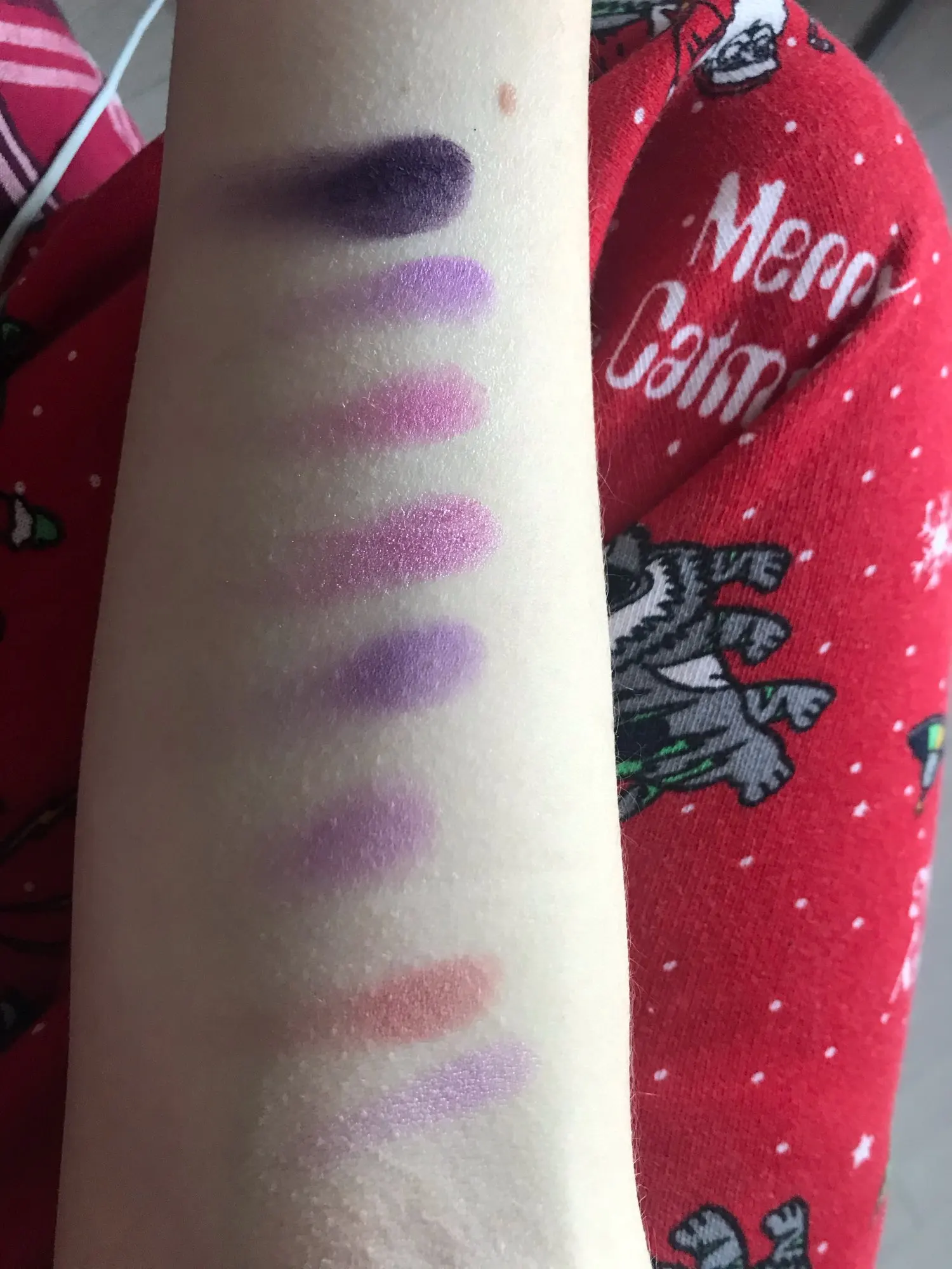 свотчи вы увидите в комментах, их достаточно. желтый цвет не оч - тусклый и пылит, фиолетовые оттенки матовые тоже тусклые и пылят. шимеры отвал всего. но палетка все равно оч классная и красивая. черный цвет хорош, плотный, яркий. макияжи этой палеткой можете глянуть. а так с этой палеткой я ничо такая фролля