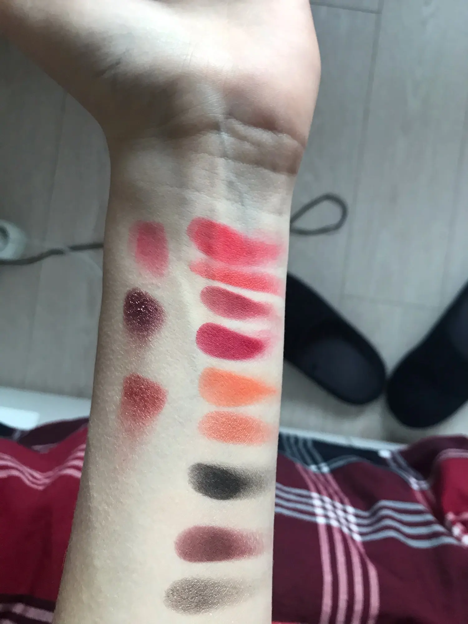 Мне палетка понравилась, были трудности с получением тк курьер не смог доставитт с первого раза, но это мелочи, решилось всё быстро с курьерской службой. Сама палетка имеет резковатый запах после открытия, но быстро проходит. Первые две руки на фото это матовые, вторые две это все блестяшки, свочила сверху вниз слева направо(два свайпа по рефилу и своч) . В жизни свочи чуть посветлее(не тусклее, а именно светлее, камера затемняет). Пробовала матовые на глазу из верхних рядов, работали тускловато, но блестяшки, просто агонь. Думаю с праймером будет лучше. Палетка стоит своих денег, я её советую!