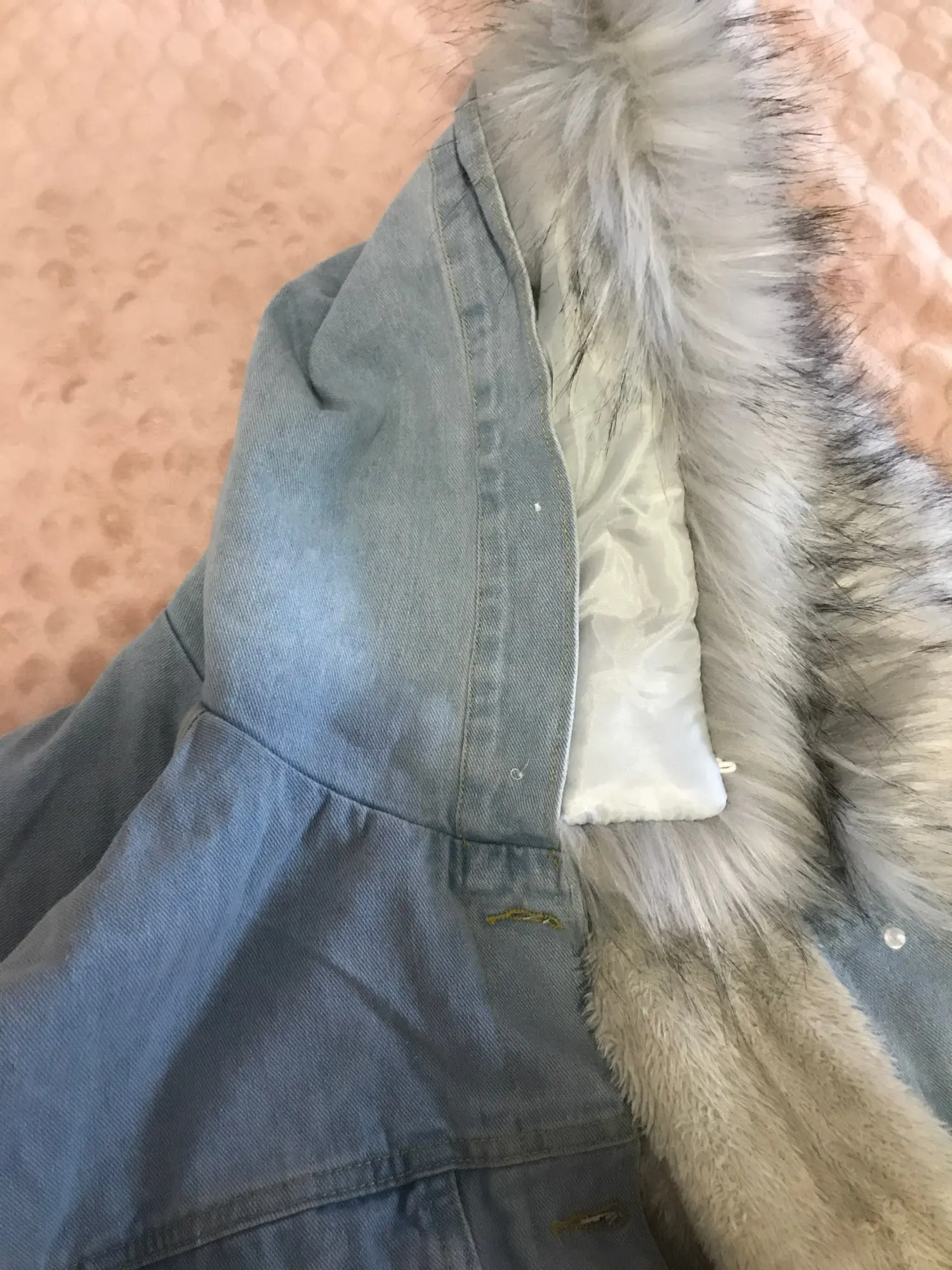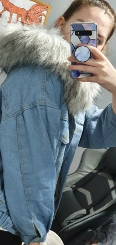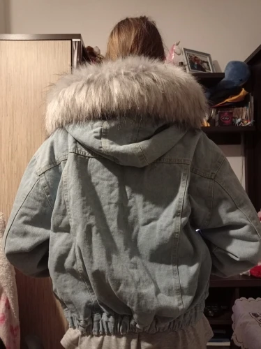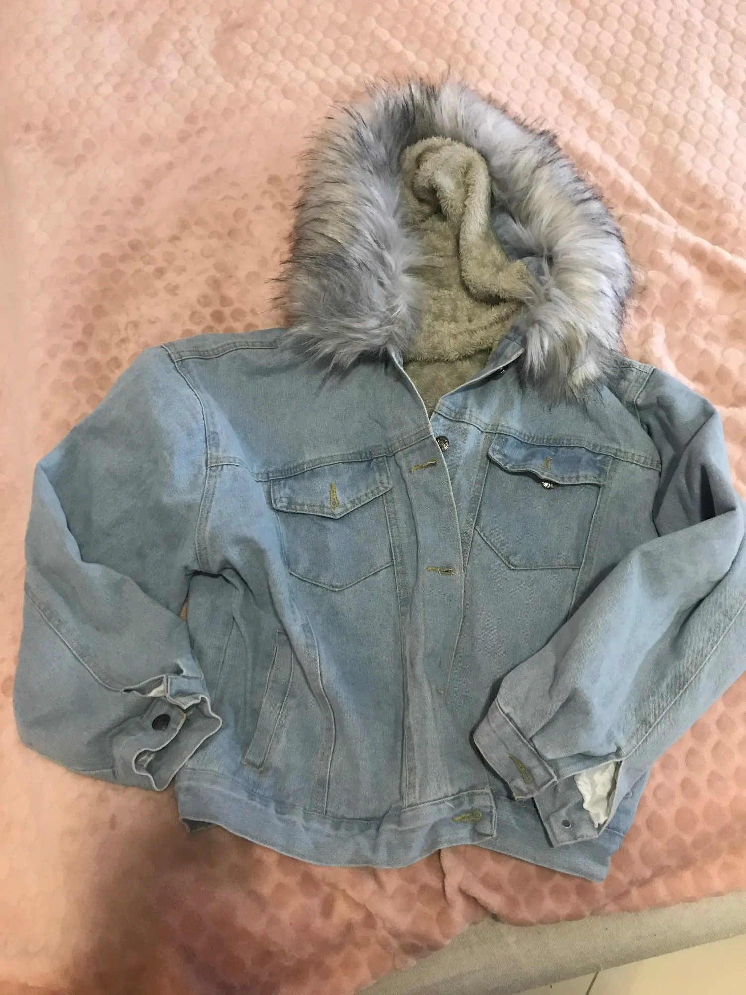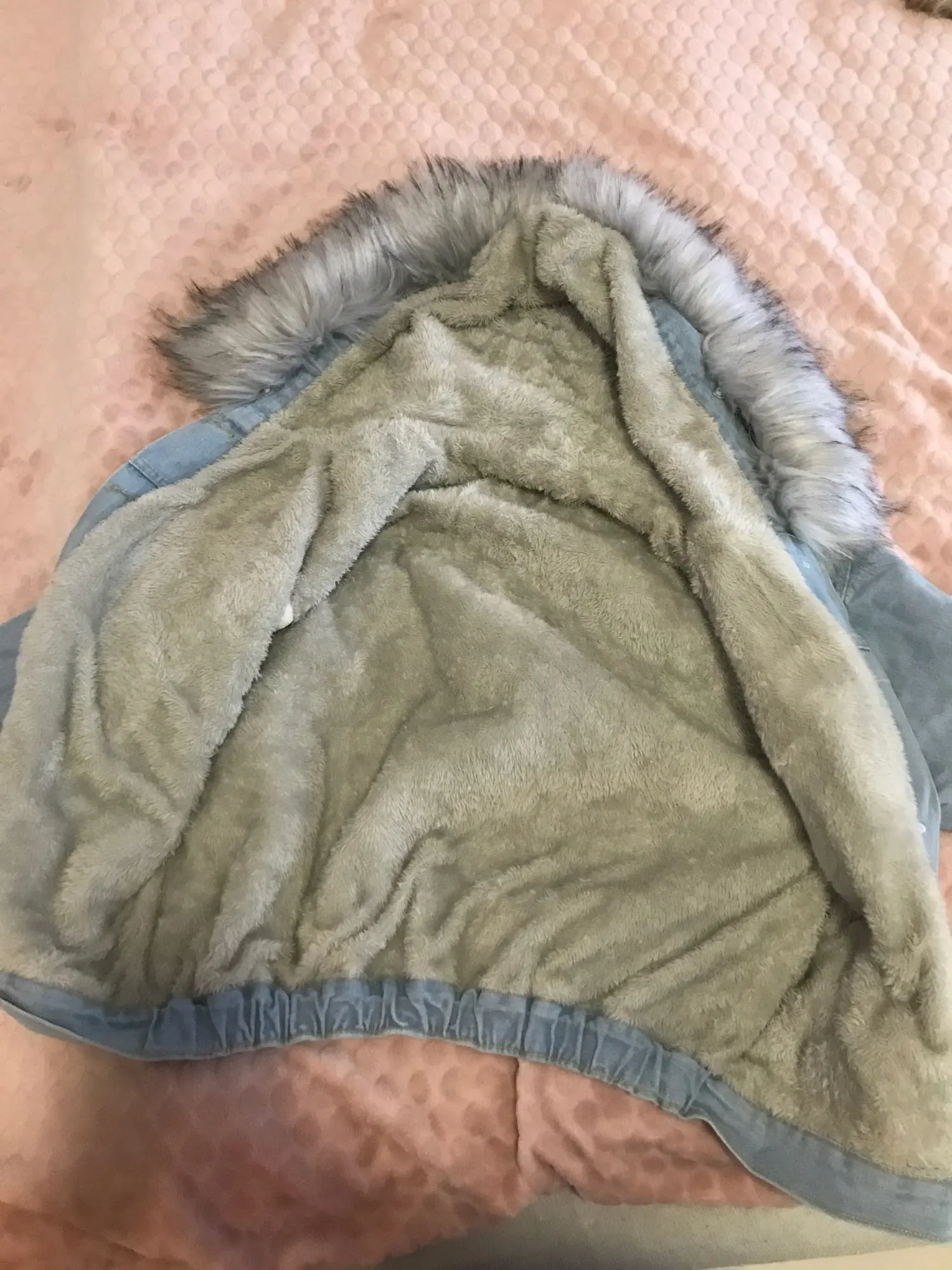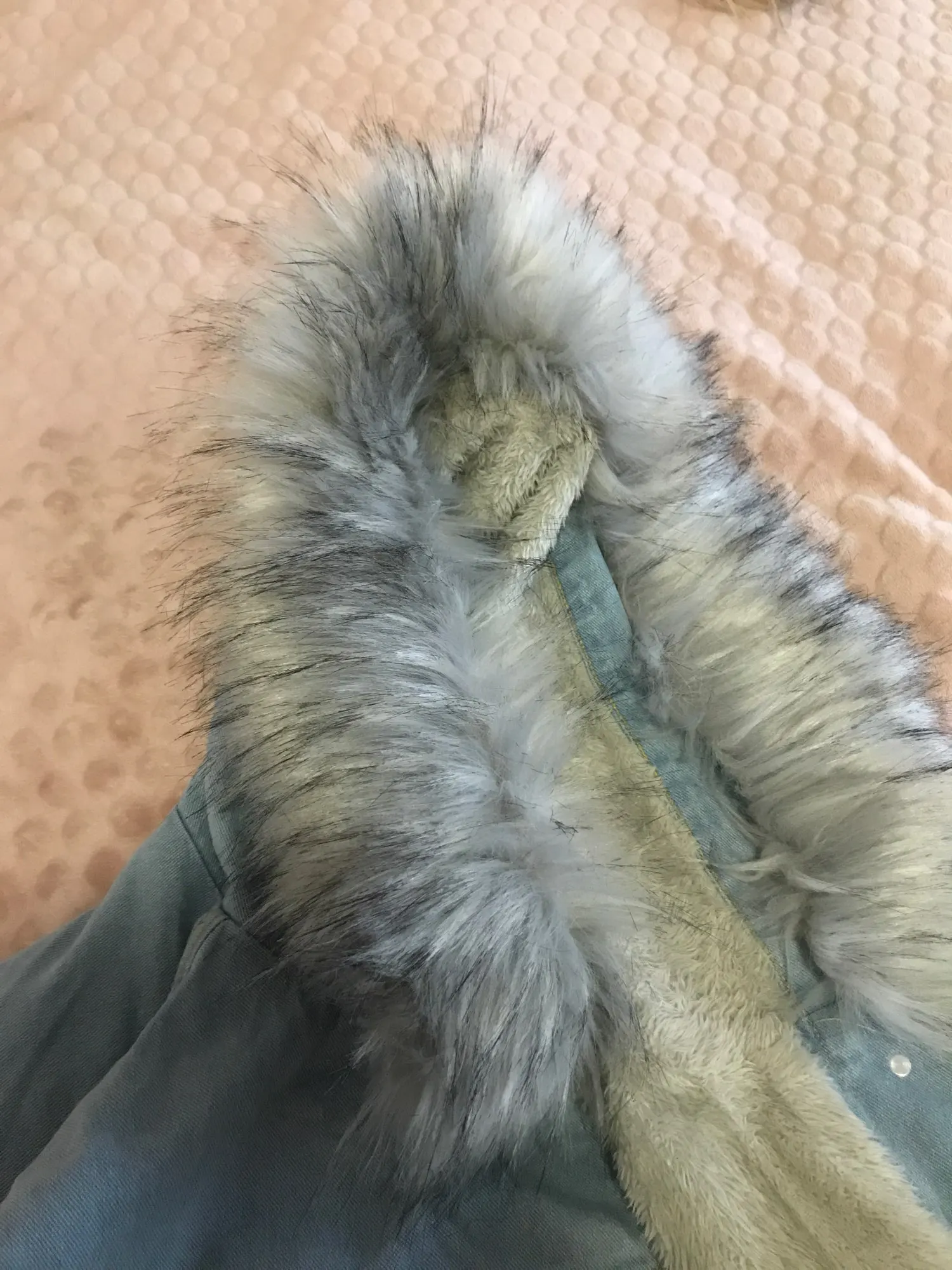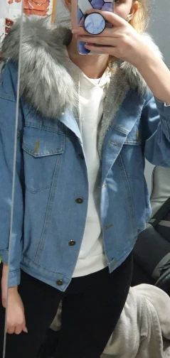 Посылка прибыла менее одного месяца. В упаковке была куртка, лента для волос и листовка. Я заказал размер S, обычно я ношу размер S/M, и он идеален. Материал-джинсы, я думаю. Мех можно прикрепить или открепить-Вы сами решите. Есть один ряд пуговиц-я думаю, что лучше иметь рядом, но я прикрепил мех с обеих сторон в один ряд. Цвет внутри немного отличается от меха (мех прикреплен к капюшону серый), но я не против. Рукава не имеют меха. Теплая куртка и очень большой капюшон. Я не уверен, что это хороший продукт для зимы, но для осени точно☺②