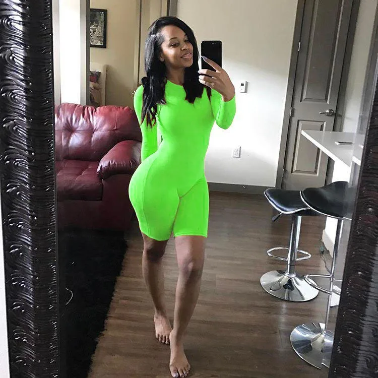 Женский Повседневный комбинезон с длинным рукавом, неоновый желтый комбинезон с шортами для фитнеса на осень, 2019, S-2XL