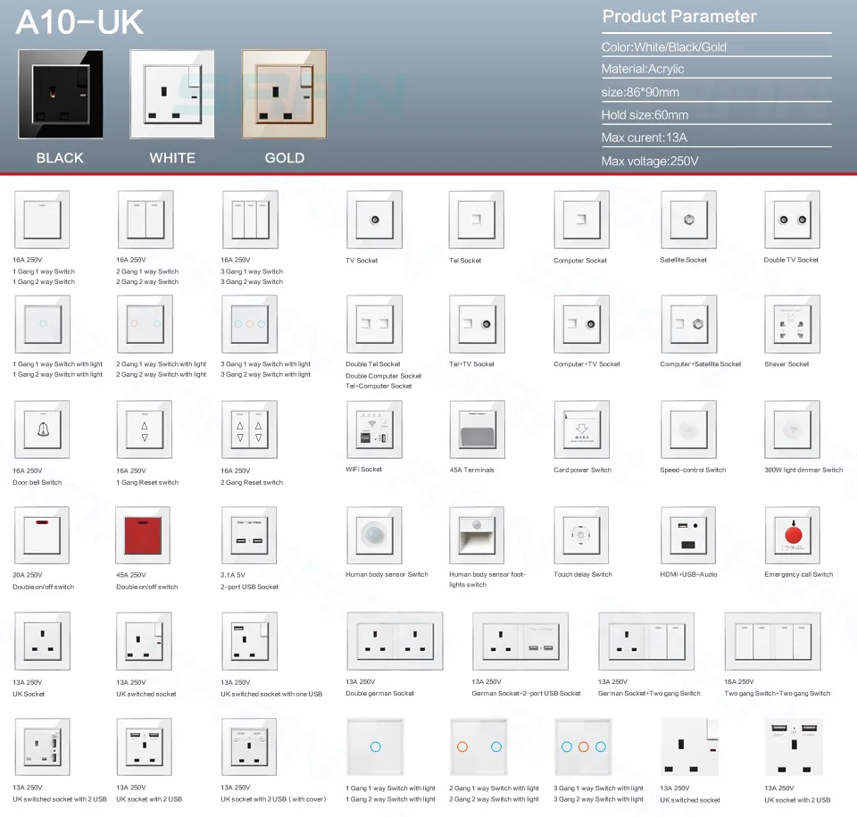 Настенный выключатель SRAN серии A1, белая панель для ПК, европейск...