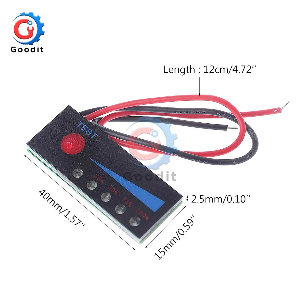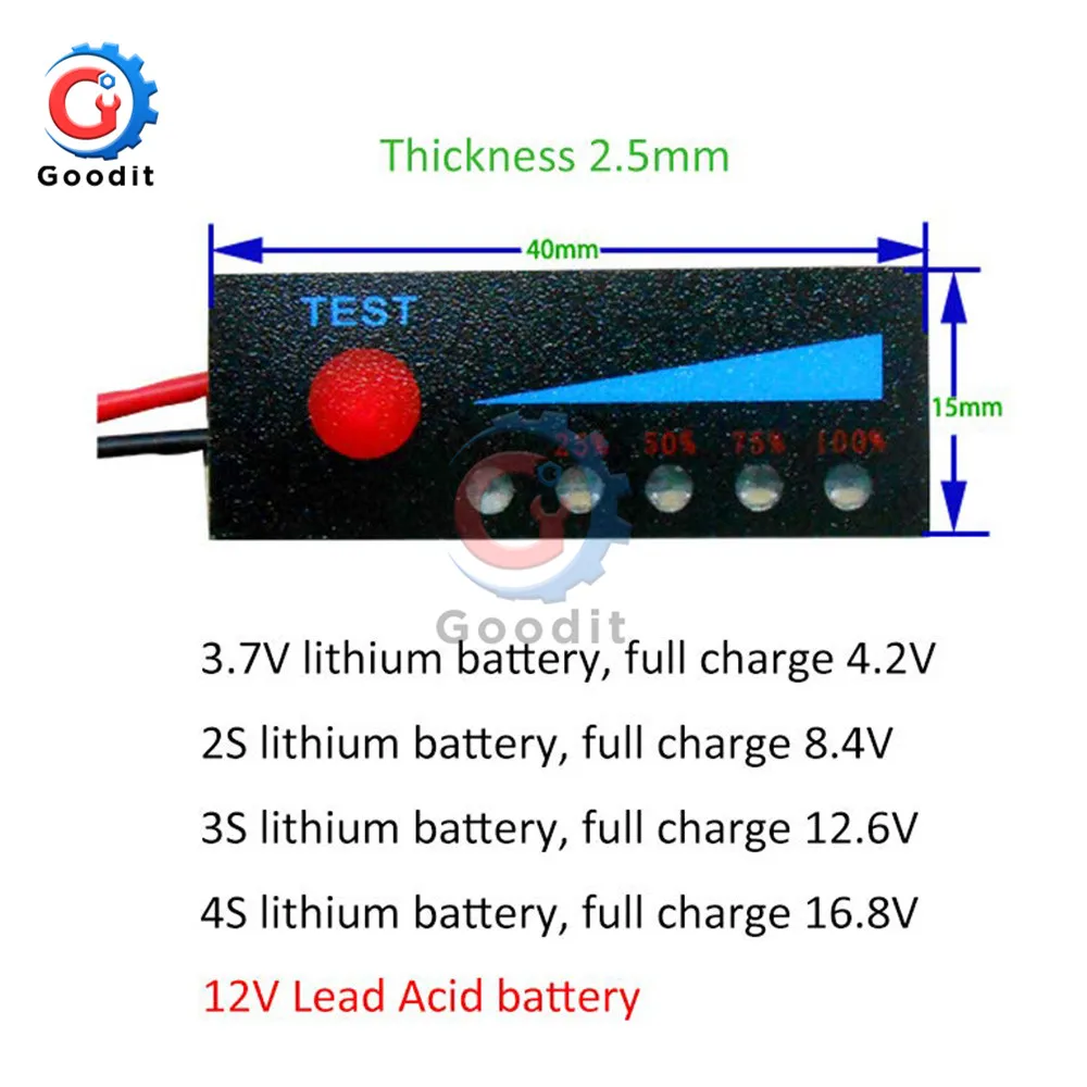 100% абсолютно новый и высококачественный 18650 литий-ионный индикатор уровня заряда батареиИндикатор уровня литий-ионной батареи:(Допускается погрешность 2%)Напряжение батареи> N * 3,2 V, 1 светодиодный индикатор (Примечание: N = номер батареи)Напряжение батареи> N * 3,4 V, 2 светодиодный индикаторНапряжение батареи> N * 3,6 V, 3 светодиодный индикаторНапряжение батареи> N * 3,8 V, 4 светодиодный индикатор12 В свинцово-кислотный уровень заряда батареи Диапазон отображения:(4S литий-железо-фосфатная батарея может быть приемлемой)Напряжение батареи превышает 11 В, 1 светодиодный индикаторНапряжение батареи составляет более 11,6 V, 2 светодиодный загораетсяНапряжение батареи составляет более 12,3 V, 3 светодиодный загораетсяНапряжение батареи превышает 13 в, 4 светодиодный индикатор3,7 V литиевая батарея, полная зарядка 4,2 V2S литиевая батарея 7,4 V, полная зарядка 8,4 V3S литиевая батарея 12V, полная зарядка 12,6 V4S литиевая батарея, полная зарядка 16,8 в5S литиевая батарея, зарядное устройство, 21V6S литиевая батарея, полная зарядка 25,2 V7S литиевая батарея, полная зарядка 29,4 V12V свинцово-кислотный аккумуляторной батареи, 12V автомобильный аккумуляторРазмер: 15*40*2,5 мм (Д * Ш * В)Длина кабеля: 140 мм Действие:Пожалуйста обработки пальцами светильник ly нажмите красную кнопку при температуре зарядного устройства или разрядки, в тех случаях, когда светодиодный светильник s, светильник линия доски ток составляет около 30mA.Отпустите палец, светодиодный светильник s выйдет из строя, светильник отключается, без тока.Плата с обратной функцией, линия подключена или неправильно, нет проблем, отрегулируйте ееВ общей сложности 5 небольших ламп, мощность дисплея, подходит для Реверсивный преобразователь питания литиевой батареи3,7 V типа с 1 шт. красный индикатор питания индикатор, 4 предмета в комплекте зеленая батарея индикатор; Остальные с 1 шт. красный индикатор питания индикатор, 4 шт. синий батарея индикатор