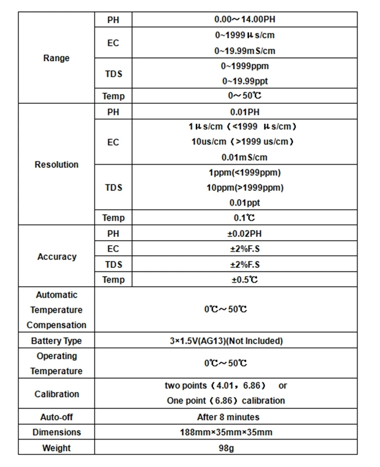 1х 4в1 рН метр (батарея в комплект не входит) 1x руководство на английском языке 1x коробка