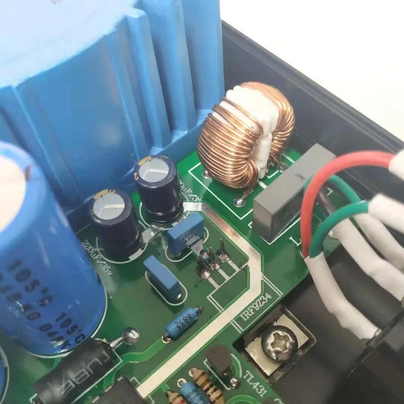 доехало за вменяемый срок, доставка до квартиры. упаковка бронебойная. сетевого шнура нет, в комплекте только DC-DC. на задней панели винтик подстройки напряжения. при подключении потребителя напряжение не падает. в сеть фонит минимально