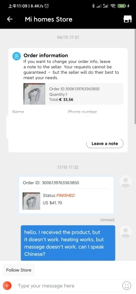 Плохой продавец, массажер прибыл с дефектом и не вступил во владение. После того, как я отправил ему видео, показывающее, что оно не сработало, оно продолжало без учета его замены. Поверьте спор, и AliExpress вернет сумму. Я не рекомендую покупать у этого продавца.