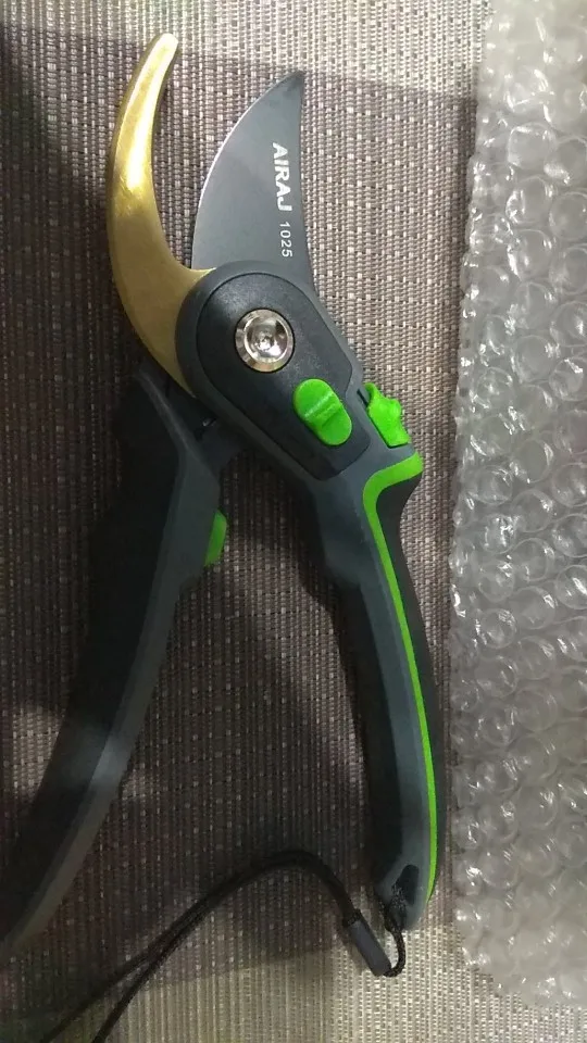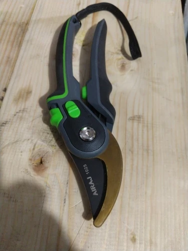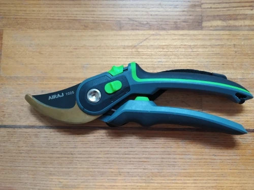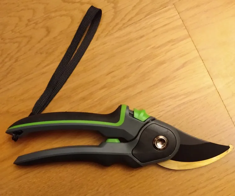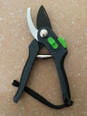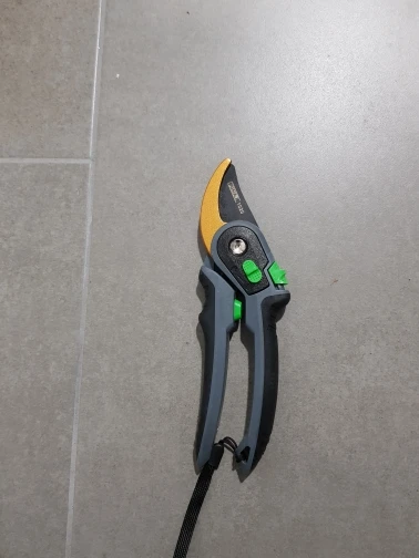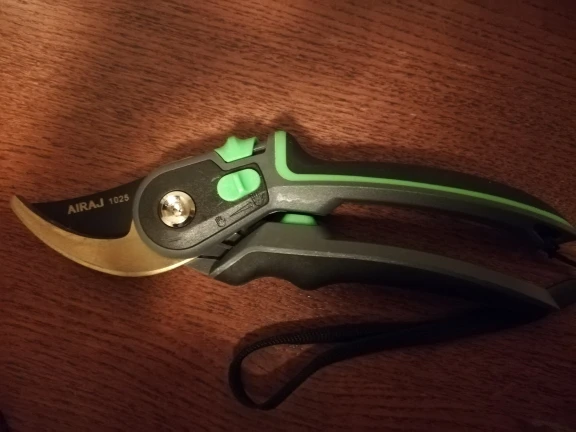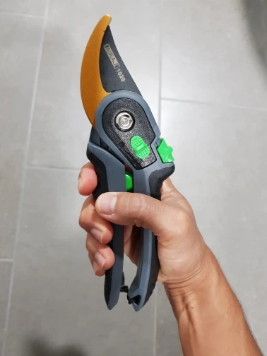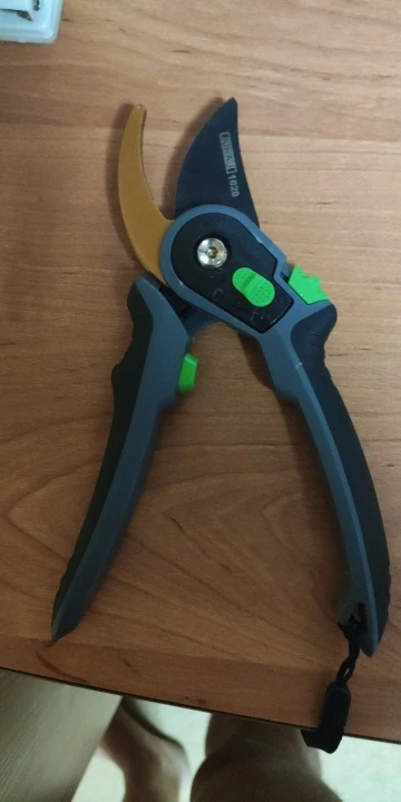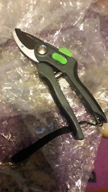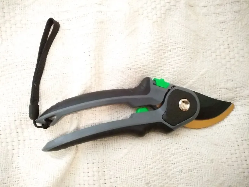 Зачётный секатор! Я такого еще не видел. Удобная ручка, удобное управление. Два режима - хотите, можно включить открытие на полную лезвий, а хотите - губки раскрываются на половину, что очень удобно! А еще - верхнее и нижнее лезвие сделано из металла. Рекомендую!
