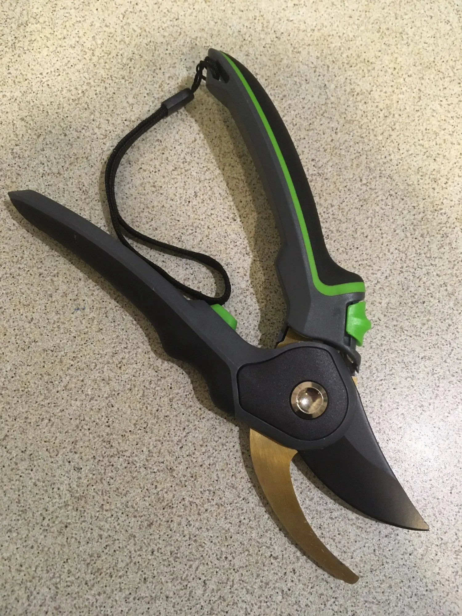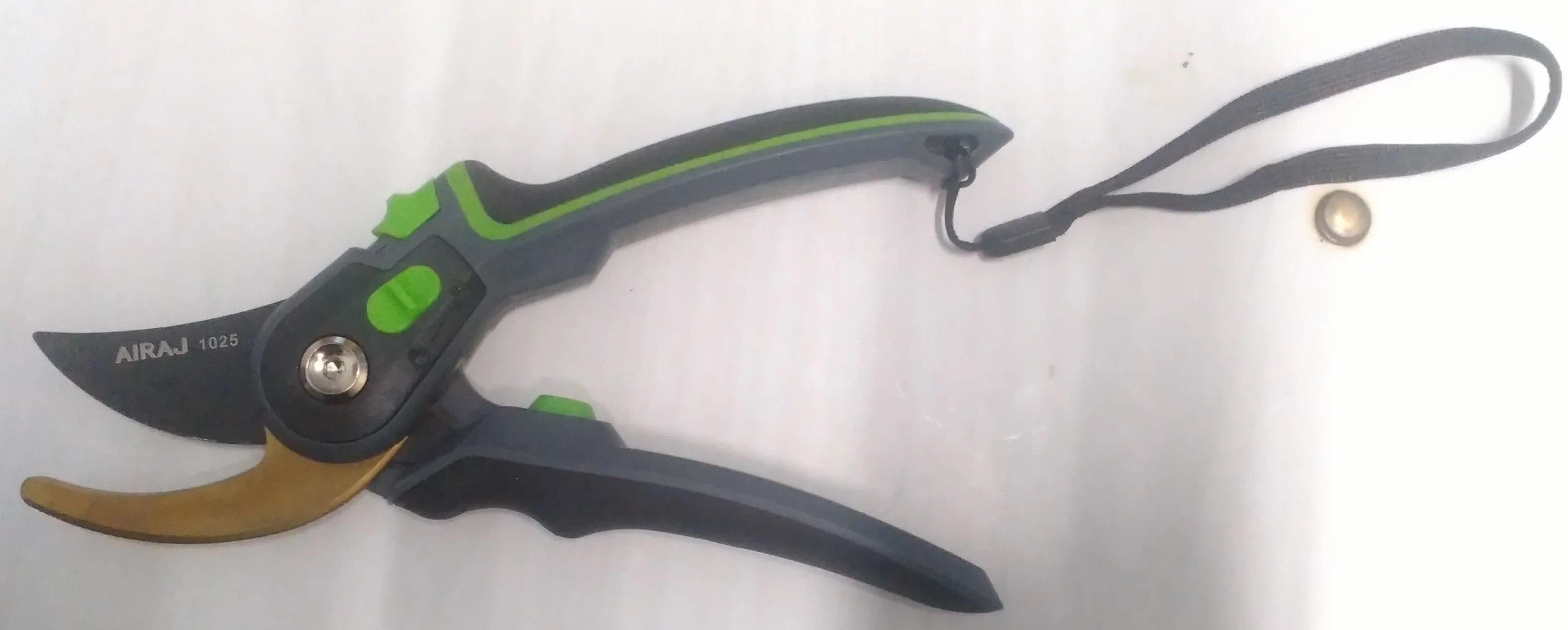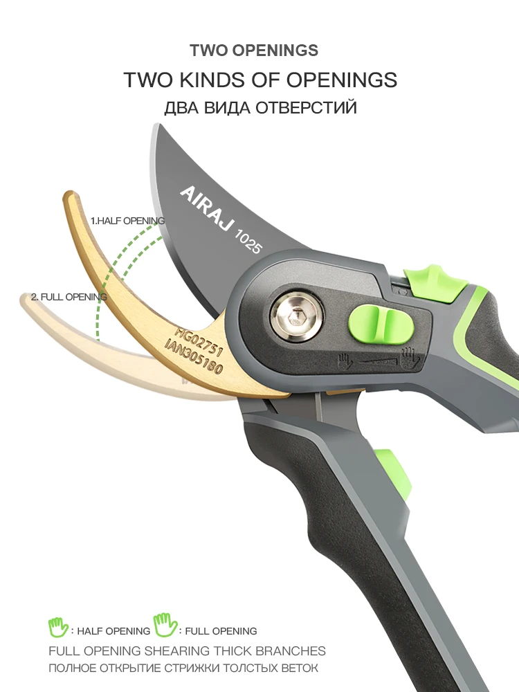 Зачётный секатор! Я такого еще не видел. Удобная ручка, удобное управление. Два режима - хотите, можно включить открытие на полную лезвий, а хотите - губки раскрываются на половину, что очень удобно! А еще - верхнее и нижнее лезвие сделано из металла. Рекомендую!