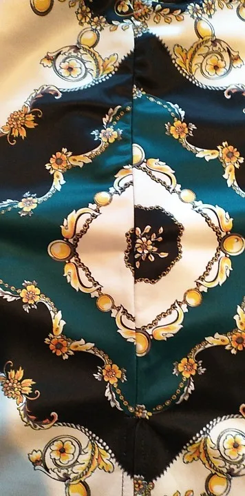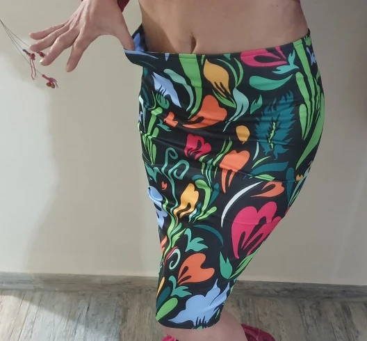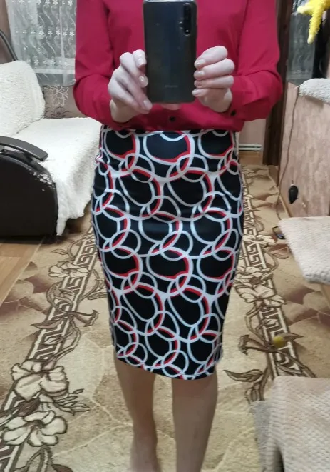 Юбка очень красивая, яркая, как на картинке. Материал немного тянется, синтетика. При моем росте 153, мне ниже колена. Но вот с рисунком проблемы. Впереди рисунок смещён в сторону. На стыках швов по бокам и сзади не совпадает. Просила заранее об этом продавца, чтобы рисунок совпадал, но увы(. При моих размерах 90-70-90 по бёдрам юбка подошла, но вот в талии оказалась очень широкой. Сшили аж на 80 см. Такое ощущение, что просто по прямой прошли. Продавец вернул часть суммы, за это 5 звёзд.