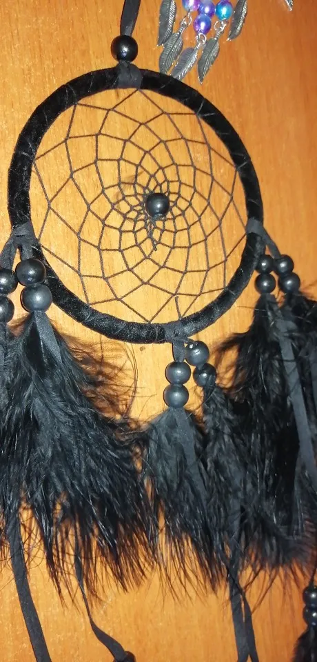Ловец снов-кошмар проходит сквозь отверстия и выходит из окна; Хорошие сны заперты в паутине, спускаются вниз по перьям к спящему человеку