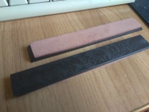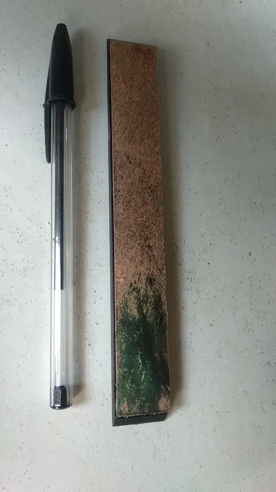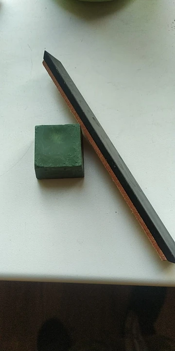 Пришло всё как в описании: дощечка, покрытая кожей, и зелёная паста, которая для полировки заточенных изделий. Всё работает.