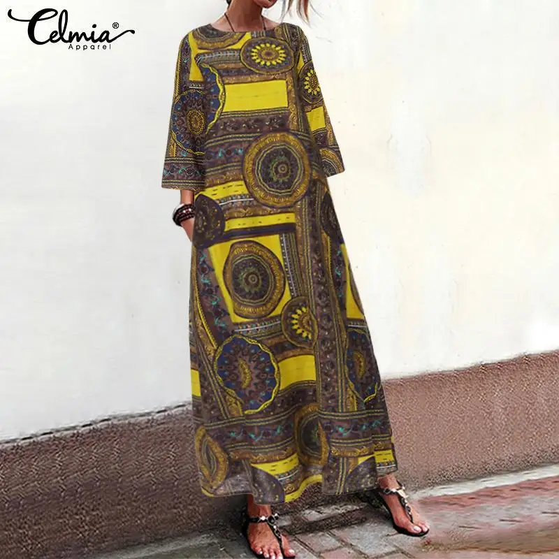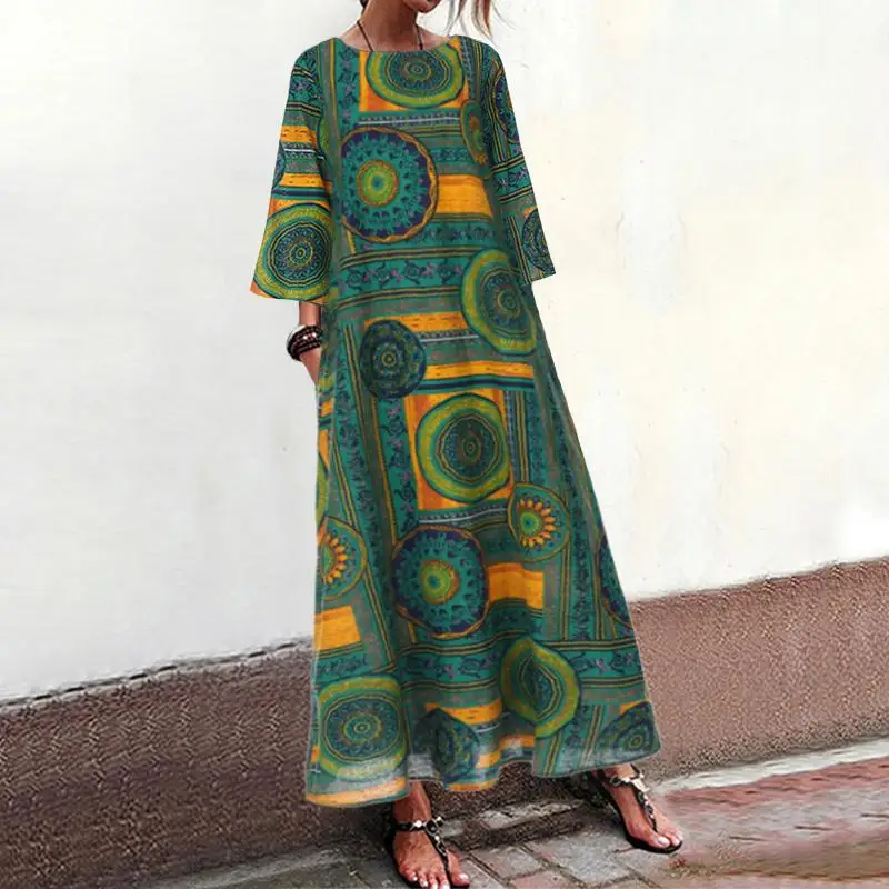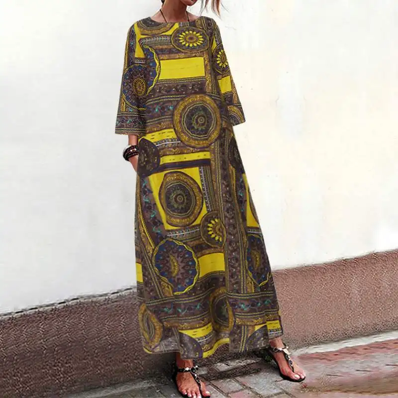Женское платье-кафтан, макси, с богемным принтом, круглым вырезом, рукавом 2021, повседневное, свободное, для вечеринок, лето 34