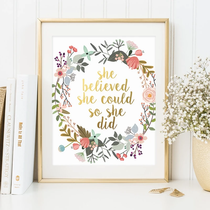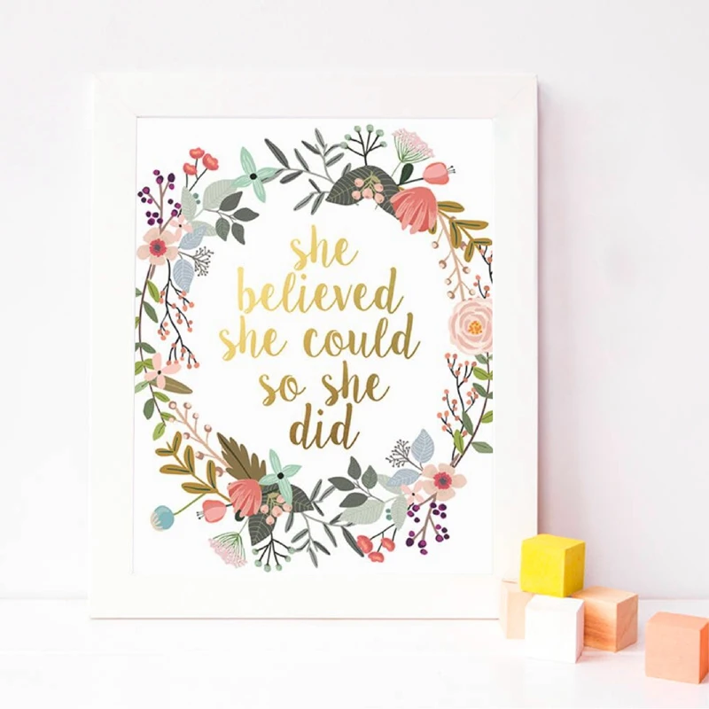 Она верила, что сможет так и сделала с принтом с цитатой подарок для девочек в детскую комнату цветочный мотивационный настенный Рисунок Картина на холсте Настенный декор