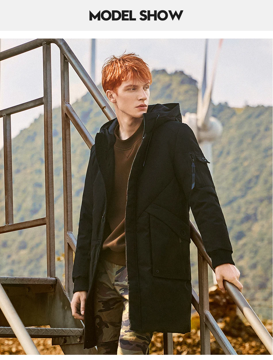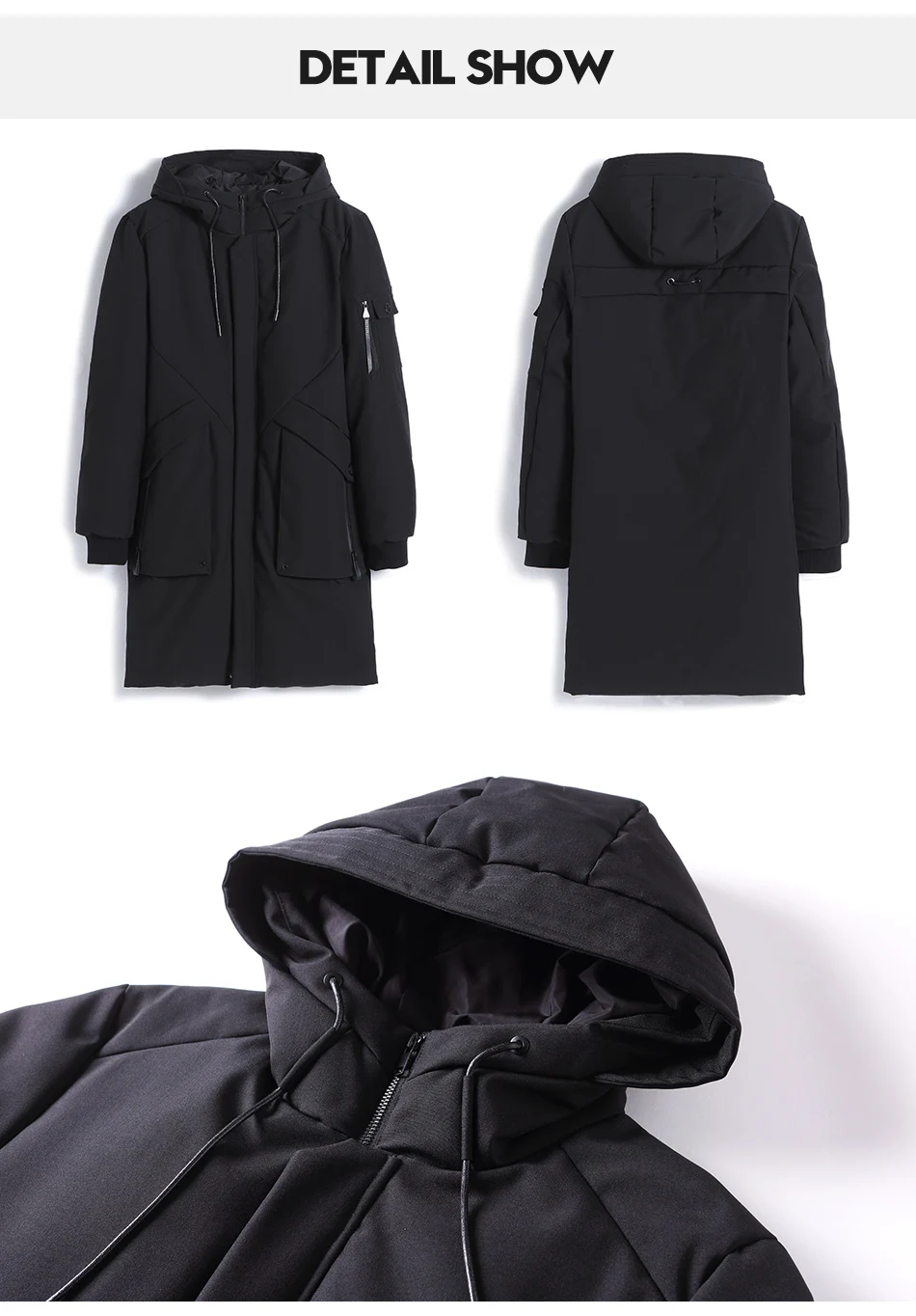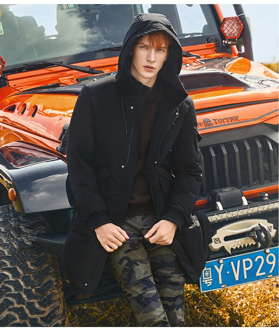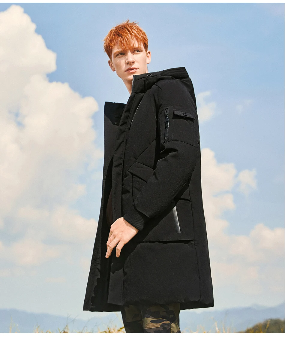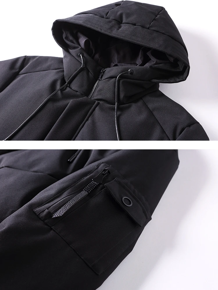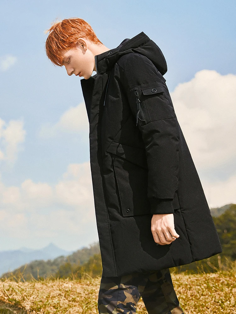 Куртка мужская зимняя на утином пуху, черная, длинная, с капюшоном, на молнии