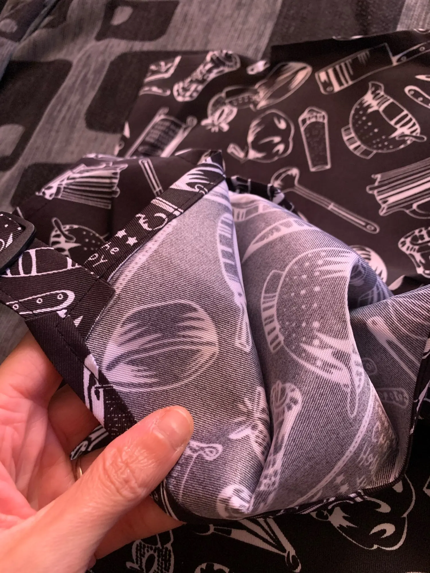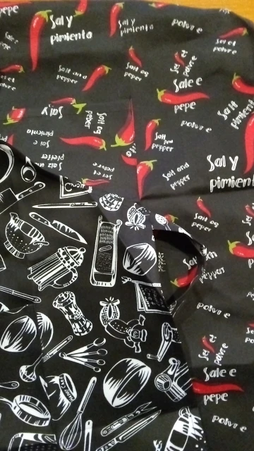 Фартук отличный. Прошит качественно. материал довольно плотный, рисунок четкий и доставка довольно быстрая.