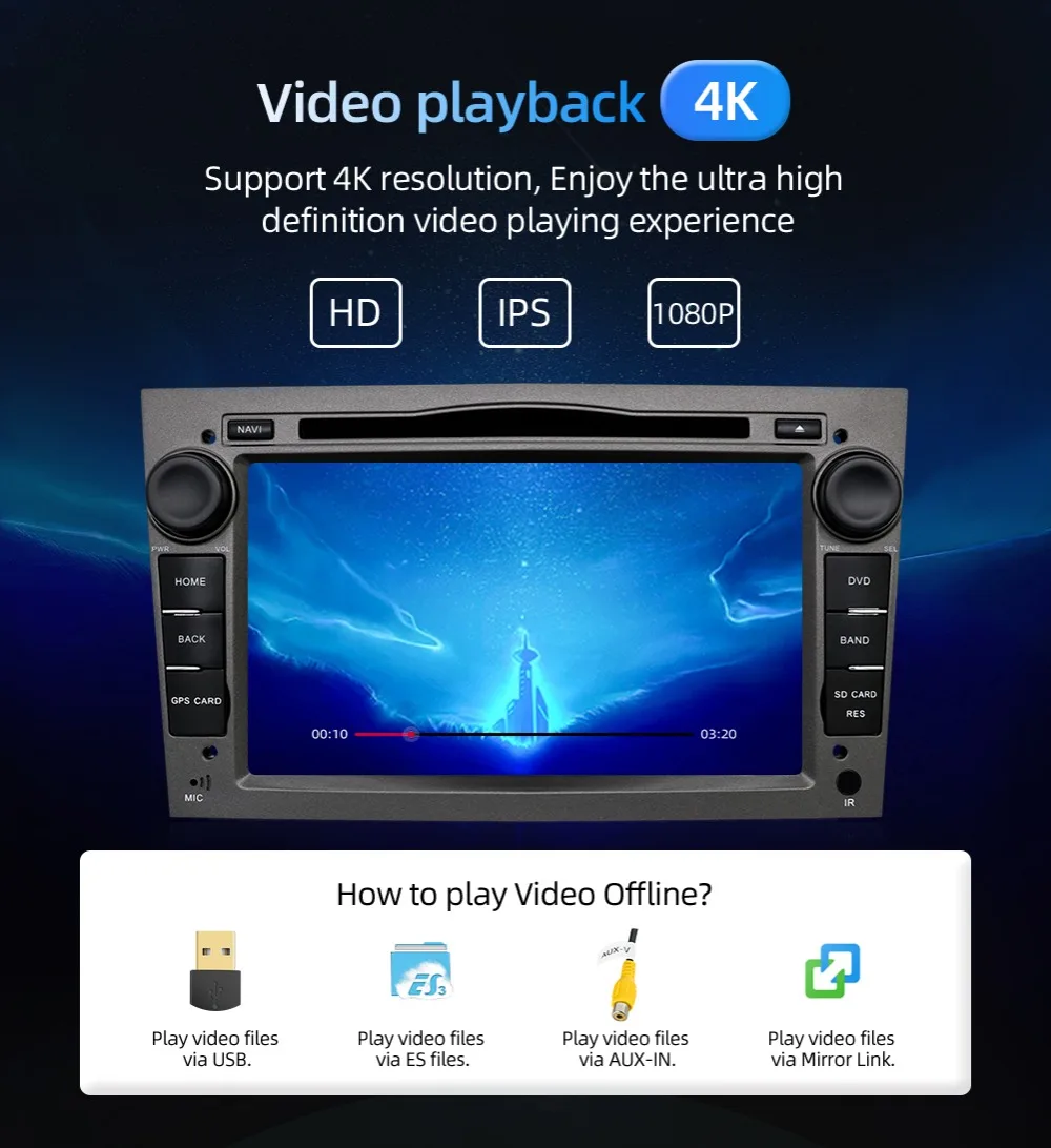 FeaturesCapacitive touch screen, Steering Wheel Control,Mic,Speakers,USB,SD