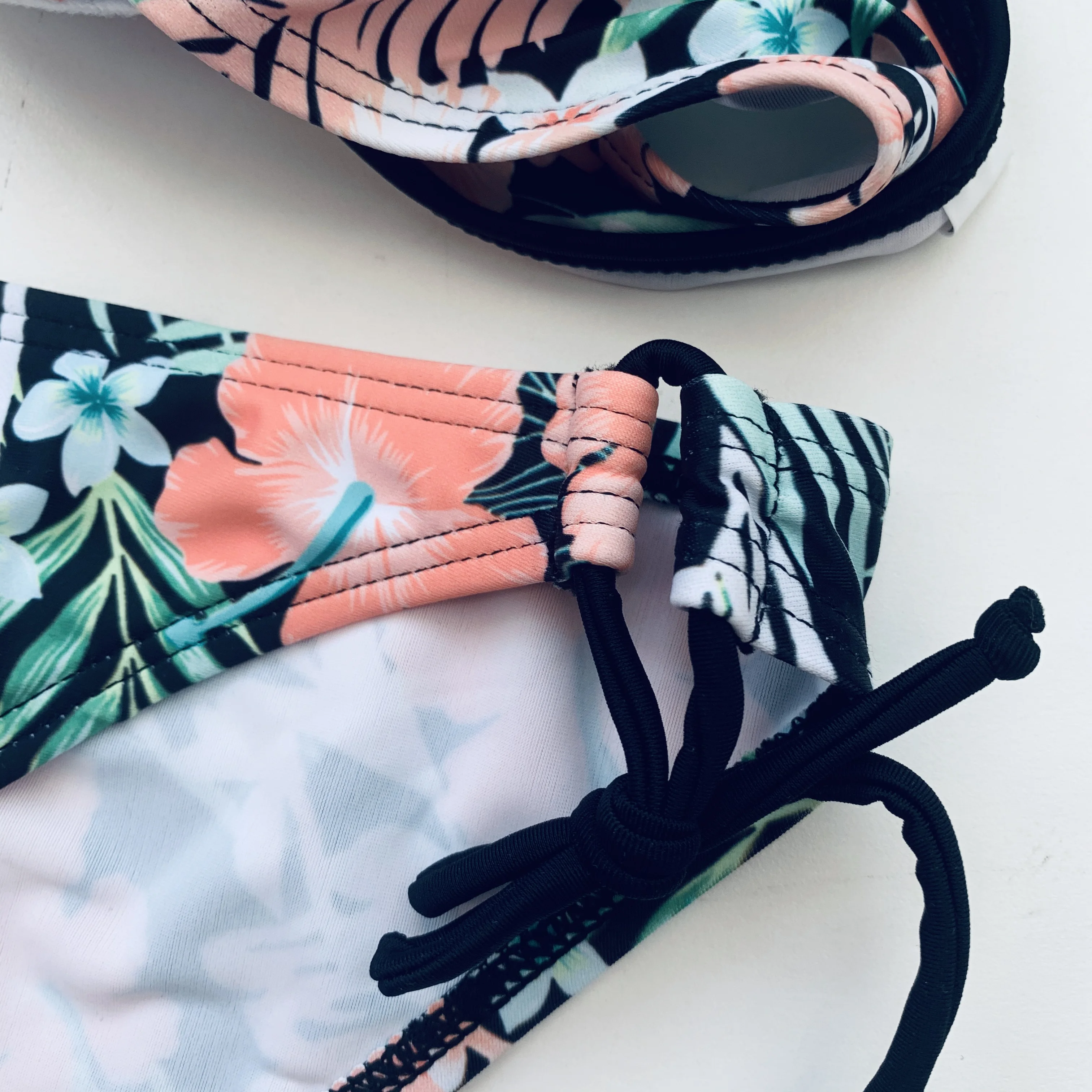 В моём вариант: Floral + M . На параметры: 85 х 60 х 90. рост 172 см. Сел хорошо! Бюст - на каркассах с пуш-ап фиксирует бюст тонкими бретелями завязками на шее, стандартная застёжка на спине. Плавки - средней посадки с черными шнурами по бокам. Купальник выполнен из Нейлон - Спандекс. Качество пошива отличное, все строчки аккуратные и ровные. Имеется защитный гигиенический стикер. Купальники мне очень понравился. Рекомендую на 100% к покупке, отличная модель!