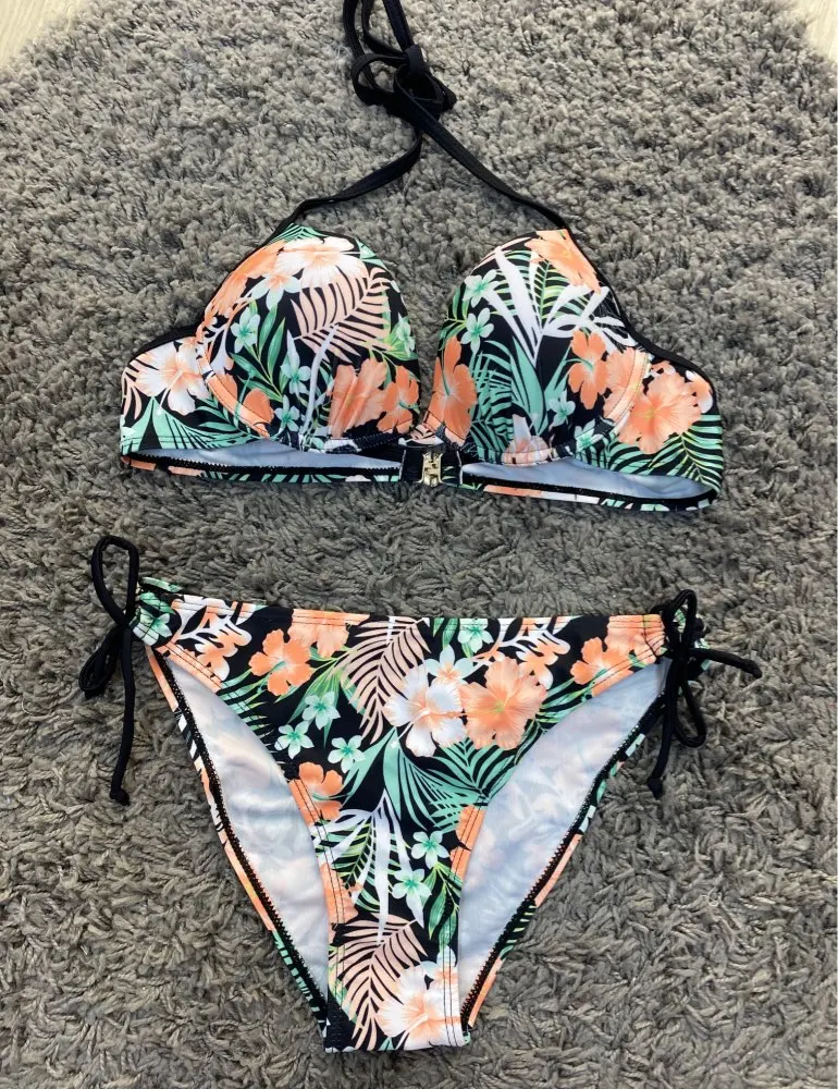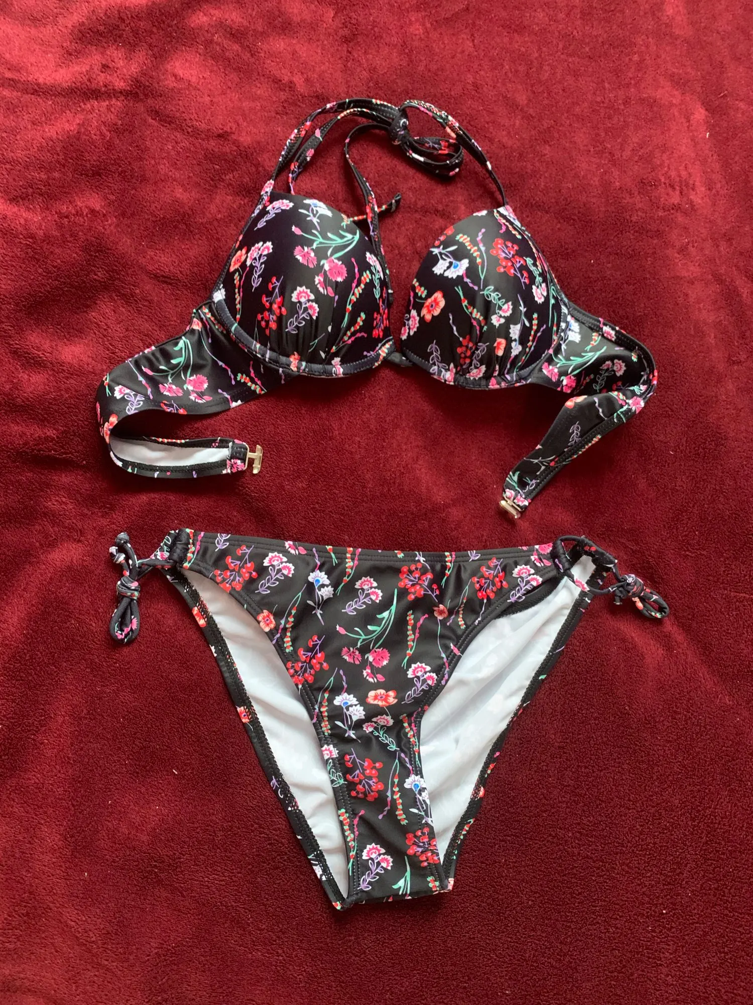 Красивый цветочный. Чашки формовые, на косточках с пуш-ап, поэтому размер S только до 2 размера. Снизу посадка средняя, по бокам регулировка завязками. Смотрится симпатично. Выгодно подчёркивает достоинства. Пошив идеальный.