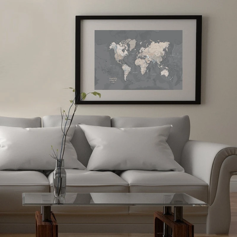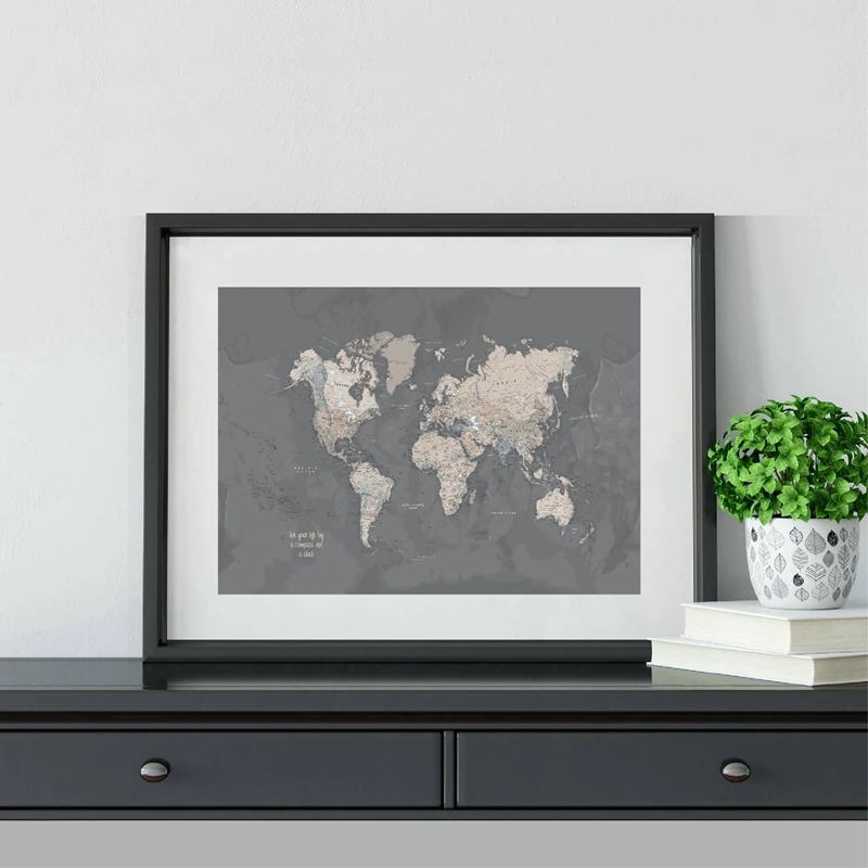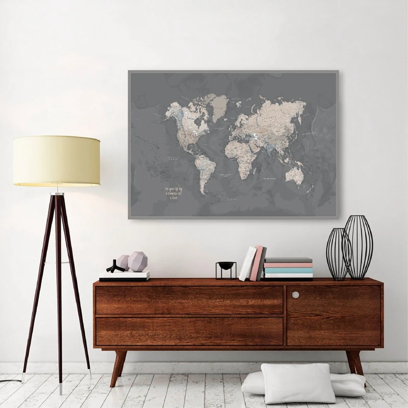 Фотография художественное изображение карты мира, серый плакат для украшения дома, компас, карта мира в реальном времени, настенное искусство, Картина на холсте, декор для спальни