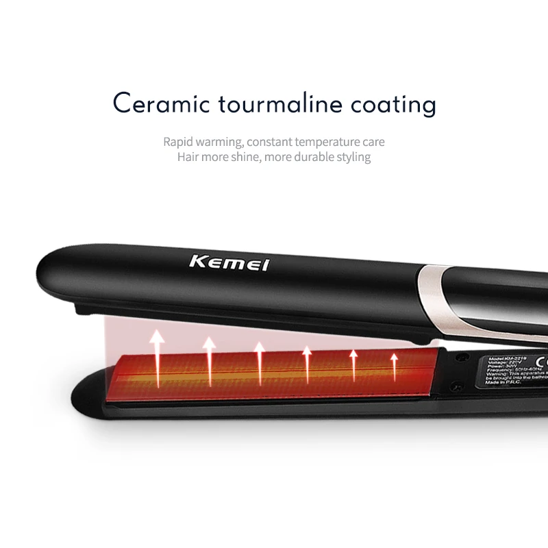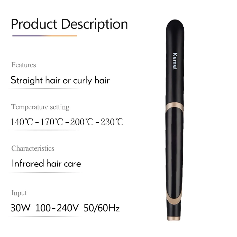 Особенность:1. Светодиодный цифровой дисплей температуры, температуру можно регулировать от 140-170-200-230 градусов Цельсия, вы можете выбрать правильную температуру в соответствии с текстурой волос.2. Конструкция плавающей пластины может уменьшить трение между волосами и пластиной, чтобы предотвратить повреждение волос, вызванное вытягиванием.3. Турмалиновое керамическое покрытие, может высвободить большое количество отрицательных ионов при нагреве, уменьшить статическое электричество волос и завихнуть, сделать ваши волосы более здоровыми.4. Функция дальнего инфракрасного излучения, может блокировать влагу и натуральное масло, сохранит ваши волосы более стойкими.5. Стильный, компактный дизайн, Универсальное напряжение 110-220 В, очень подходит для использования дома и в путешествиях. Но для области напряжения 110 В скорость нагрева медленная, для достижения максимальной температуры требуется около 10 минут, при использовании в области 220 В требуется всего 4 минуты.Спецификация:Материал теплопроводности: турмалиновая керамикаНагревательные элементы: PTCНапряжение: 220 В (также можно использовать 110)Частота: 50-60 ГцМощность: 30 ВтПодходящие волосы: сухиеТемпература: 140-170-200-230 Цельсия регулируемая (4 файла)Размер: 31*3 см (Д * Ш)Длина шнура: ок. 1,7 мЦвет: черныйВес: 292 гСодержимое упаковки:1 x бигуди для волос1 x Руководство пользователя (английский/китайский)