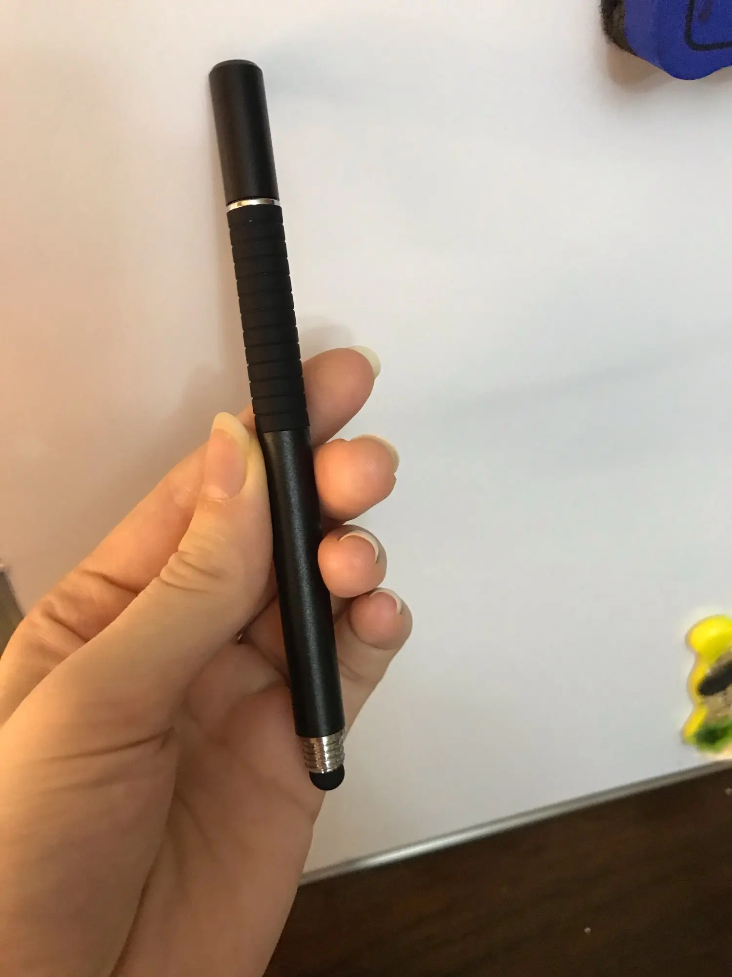 Двухсторонний стилус. Колпачок снимается с рабочей стороны и надевается на противоположную. В руке лежит удобно. Стильный.