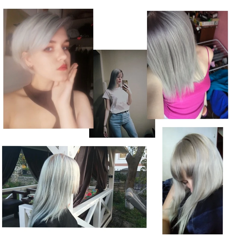 Идеально, чтобы сделать на почти белых волосах, результат очень красивый и очень однородный. Дает голубоватый эффект на тени и серебряный эффект на свет, сделанный в 1 для 1, с оксидантом на 10% и оставленный около 20 мин.