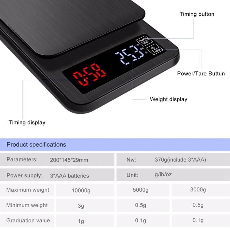 1, для шкалы ручной стирки кофейных весов и шкалы кухонных весов2, ЖК-дисплей, четкие показания и включают функции синхронизации, напоминание о низкой мощности и перегрузке3, 4 единицы преобразования: g, oz, lb4, 4 вида функциональных клавиш: вкл/выкл, тара, единицы измерения, старт/стоп Характеристики:Название: бытовой таймер для кофеМатериал: пластикЦвет:(1) винно-красный, (2) черныйРазмер: 20*14,5*3 смРежим питания: 3 батареи AAA (не входят в комплект)/USB-кабельСамое продолжительное время: 99 минут и 59 секунд (для мытья кофе вручную)Максимальный вес: 3000 г/5000 г/10000 гМинимальная точность: 0,1 г/1 гВес: 517гг