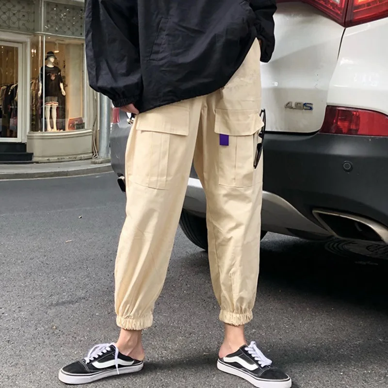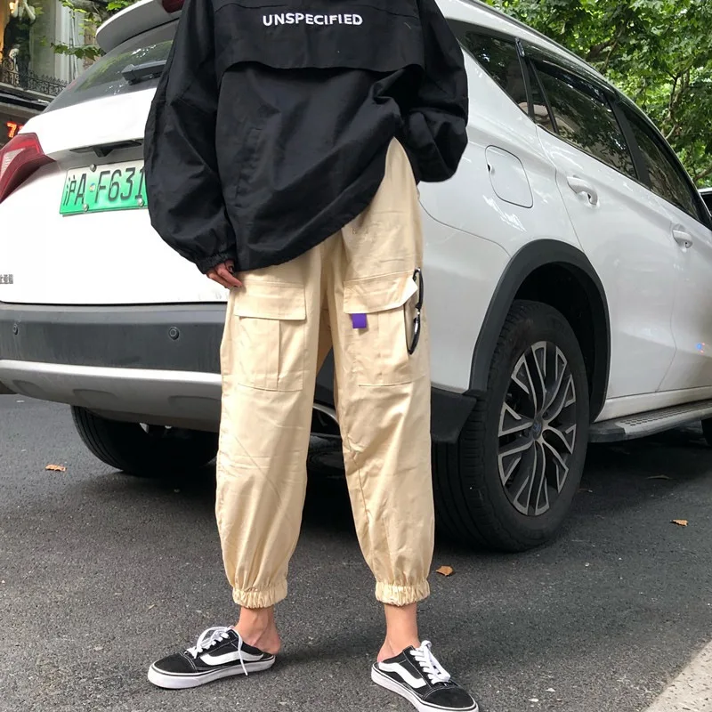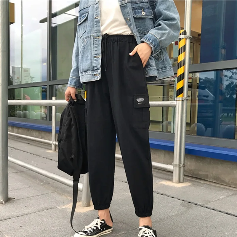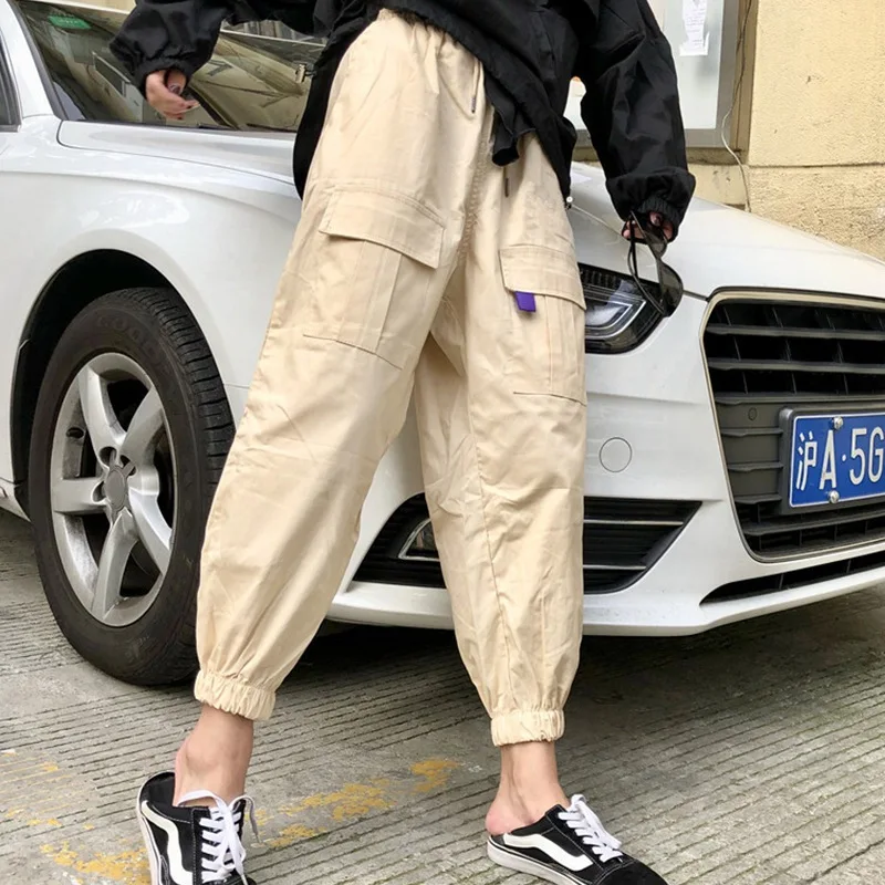 Брюки-карго в стиле Харадзюку, однотонные повседневные штаны унисекс с эластичной завышенной талией, с большими карманами
