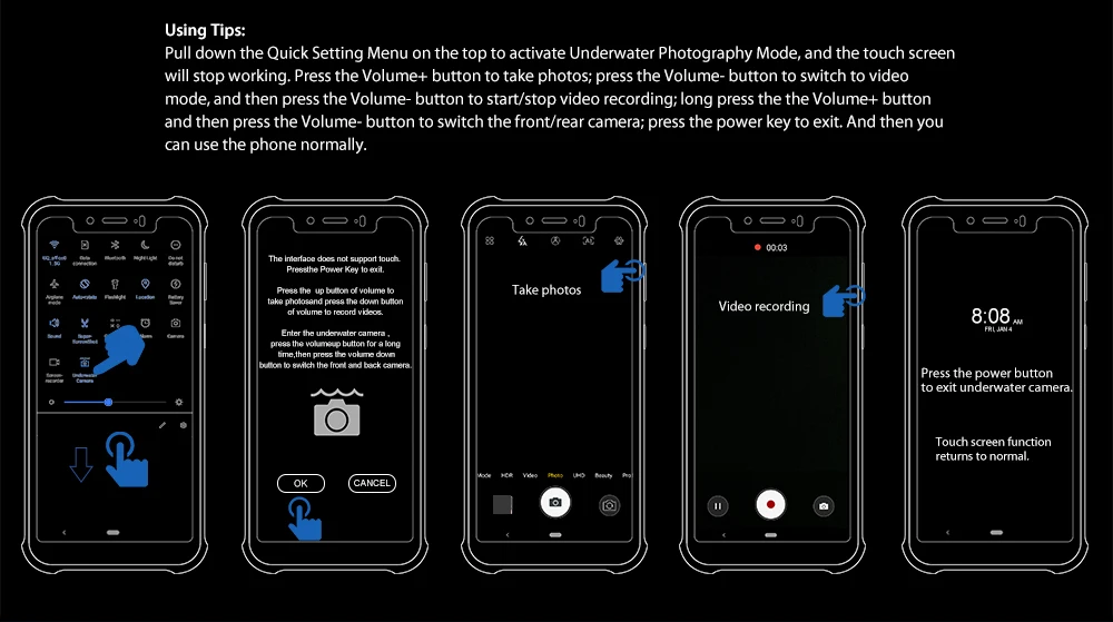 * Прочный телефон Ulefone обладает водонепроницаемостью и пыленепроницаемостью. Он был протестирован с рейтингом IP68 в соответствии с контролируемой лабораторных условиях по стандарту IEC 60529 (maxnum Глубина 1,5 метров до 30 минут). Защита от брызг воды и пыли не являются постоянными условиями, и сопротивление может уменьшиться в результате нормального износа. Не пытайтесь зарядить влажный телефон; Пожалуйста, обратитесь к инструкции по очистке и сушке. Повреждение жидкости не покрывается гарантией.