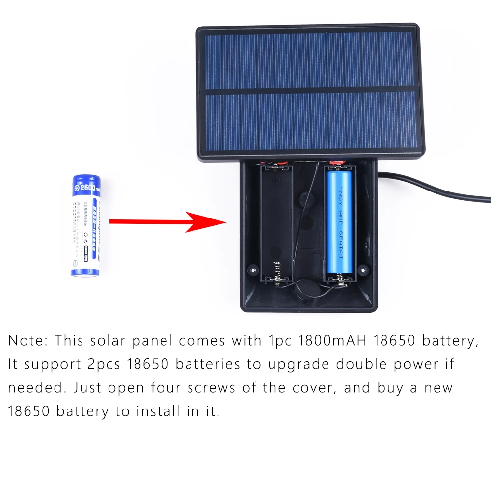 Эта солнечная панель поставляется с 1 батареей 18650 1800 мАч, она поддерживает 2 батареи 18650 для обновления двойной мощности при необходимости. Просто откройте четыре винта крышки и купите новый аккумулятор 18650 для установки в него.