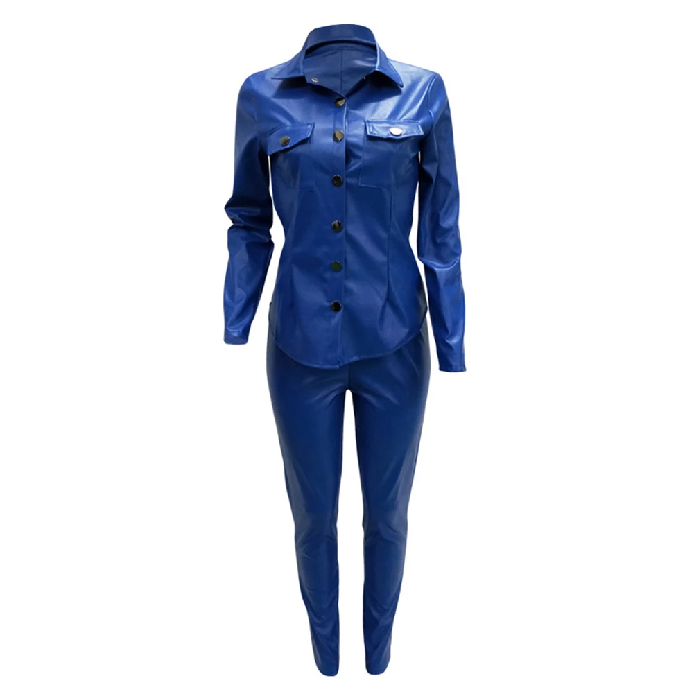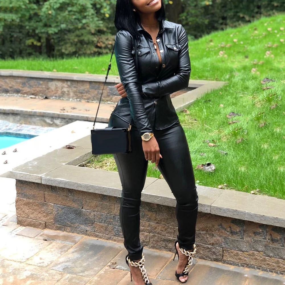 Женский спортивный костюм, зимний комбинезон из искусственной кожи, рубашка + брюки-карандаш, сексуальный комплект из двух предметов, повседневный наряд, 5 цветов, S-XXXL